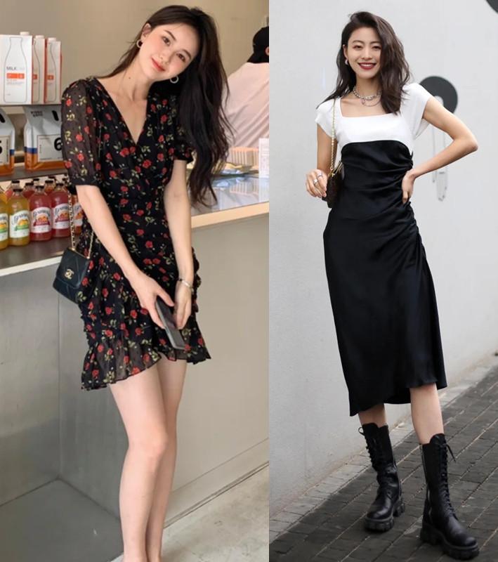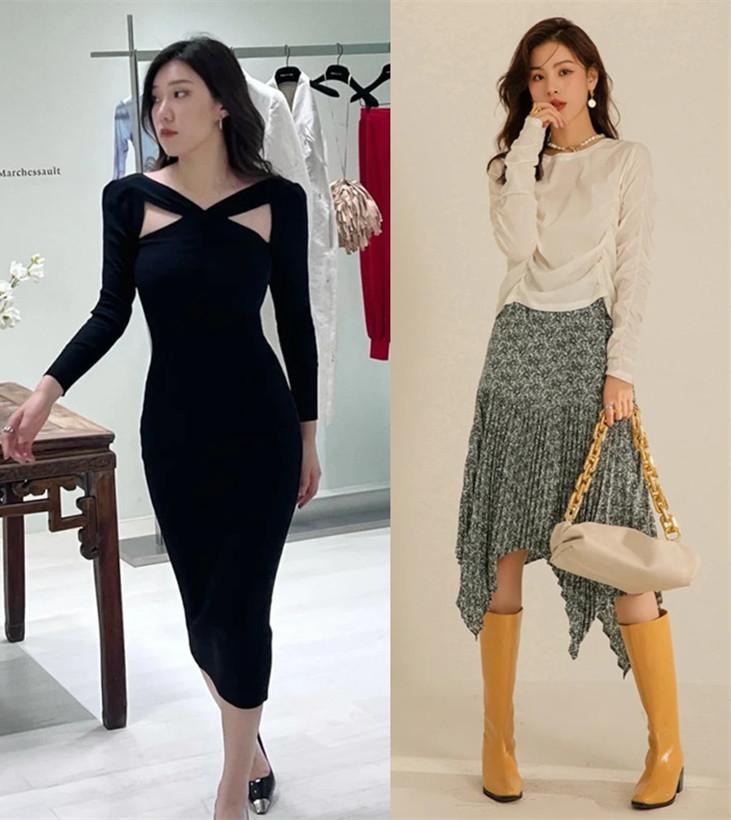 时尚潮人们十分懂得着装的重点应该放置在上半身,因而她们选择裙子的领口多是看看有没有设计。领口处没有设计的裙子,看似简单、简约,却略显单调,也无法更好地将重点上移、视觉上移,起不到延伸身形的果。而带有领口设计的裙子则可以更好地为整体增加设计感和新潮感,也能达到重点上移、视觉上移、延伸身形、显高显瘦等多种果。