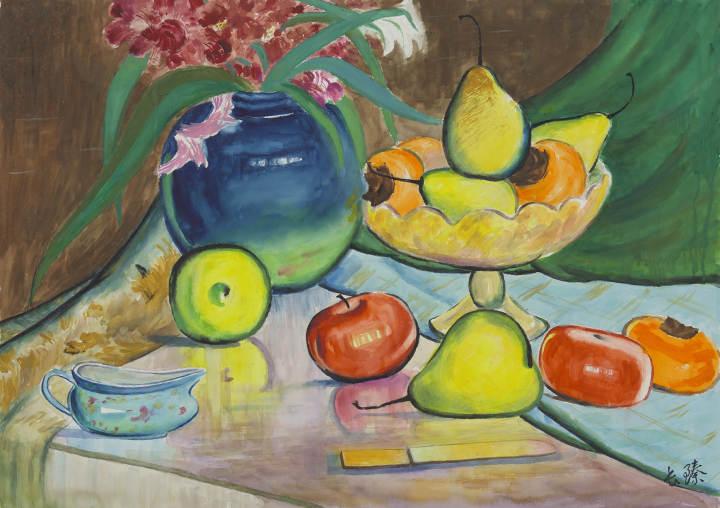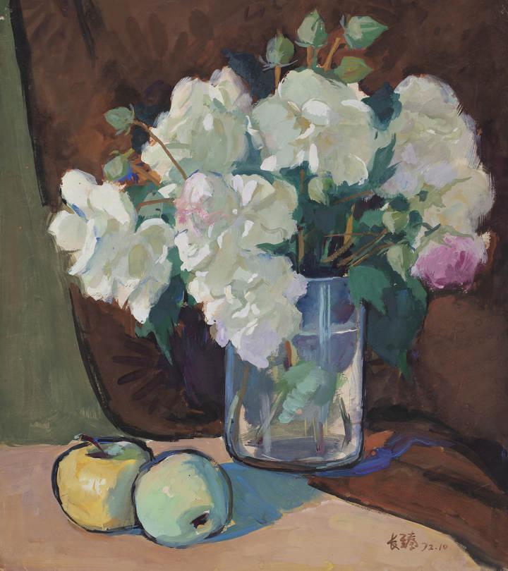 白色花和两只苹果 潘长臻 水粉画 37.5cm×33.5cm 1972