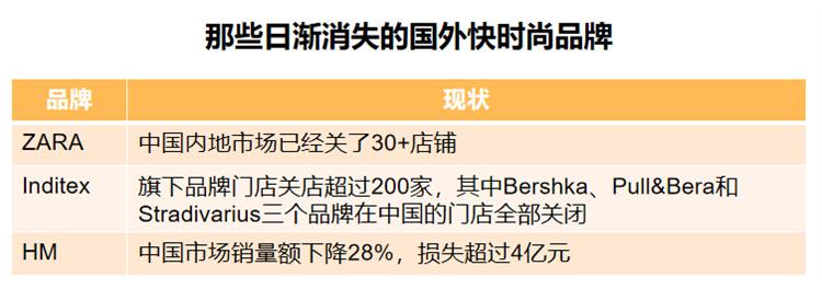 日渐消失的国外快时尚品牌随着国内快时尚品牌的不断发展,国内消费者对服饰的消费观念也逐渐改变,不再一味追求欧美,反而越发青睐本土品牌,这也导致很多国外快时尚品牌近年来一直走下坡路,比如Topshop、New Look、Forever21等快时尚品牌,已经不断从中国市场撤退。