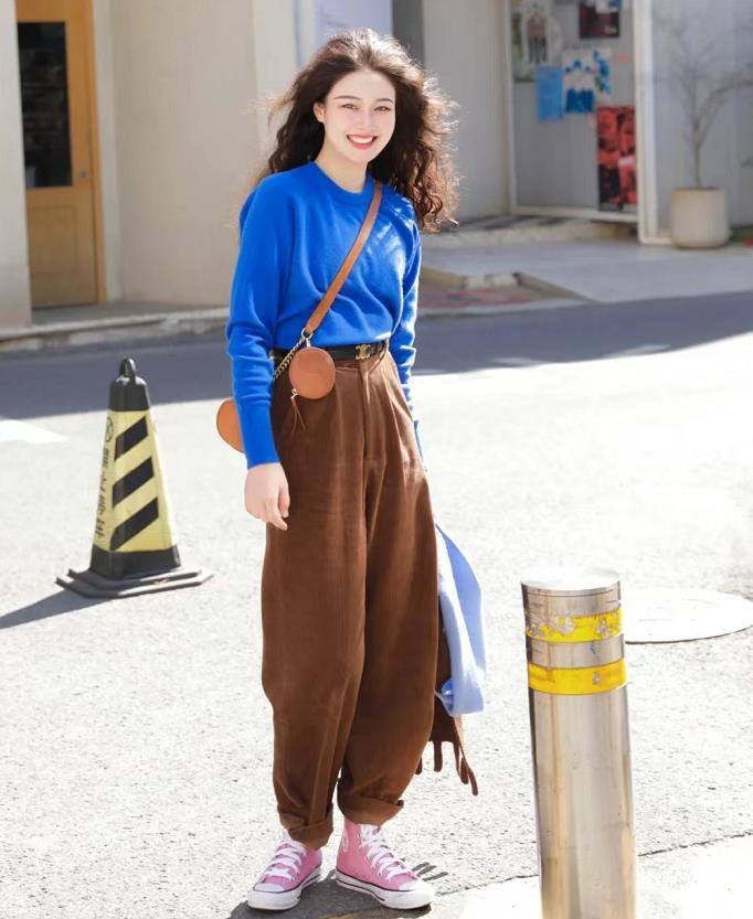 下身搭配的是一条棕色灯芯绒裤子,这种面料的裤子穿起来后可保暖了,宽度适中的版型,也十分显瘦。脚下踩着一双粉色帆布鞋,让你瞬间多了几分少女心。