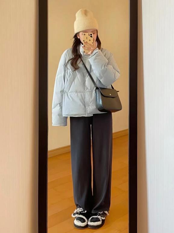 这个冬天,说什么也要为自己选择一件蓝色系的单品,特别是这种浅浅淡淡的蓝色调,无论是什么肤色都可以穿,很显肤色又显嫩。这一件浅蓝色羽绒服,款式是很简约的,但穿在身上后就很大方时尚,下装配一条黑色针织阔腿裤,垂坠感的裤子,上身后轻松拉长腿部线条,还显瘦显高挑。