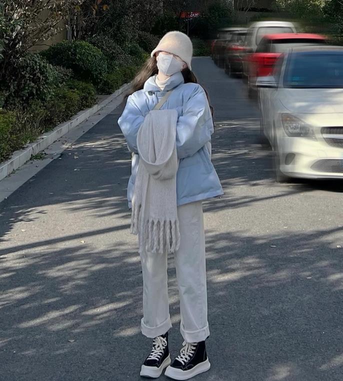 穿搭look2、浅蓝色棉服+白色牛仔直筒裤