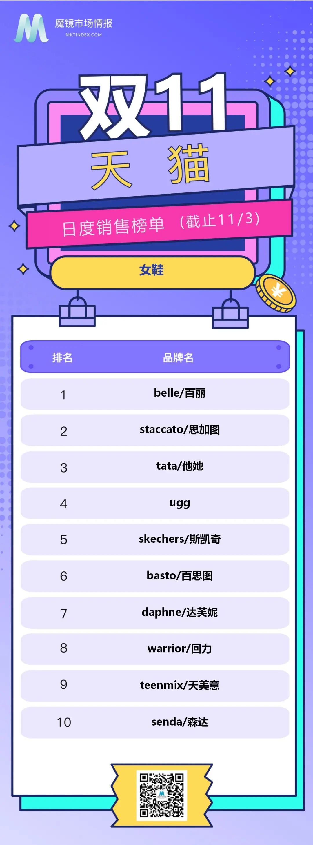 今天,魔镜市场情报为大家盘点一下运动户外、服饰鞋包行业中,天猫平台截至11月3日含预售的累计销售额品牌排行。