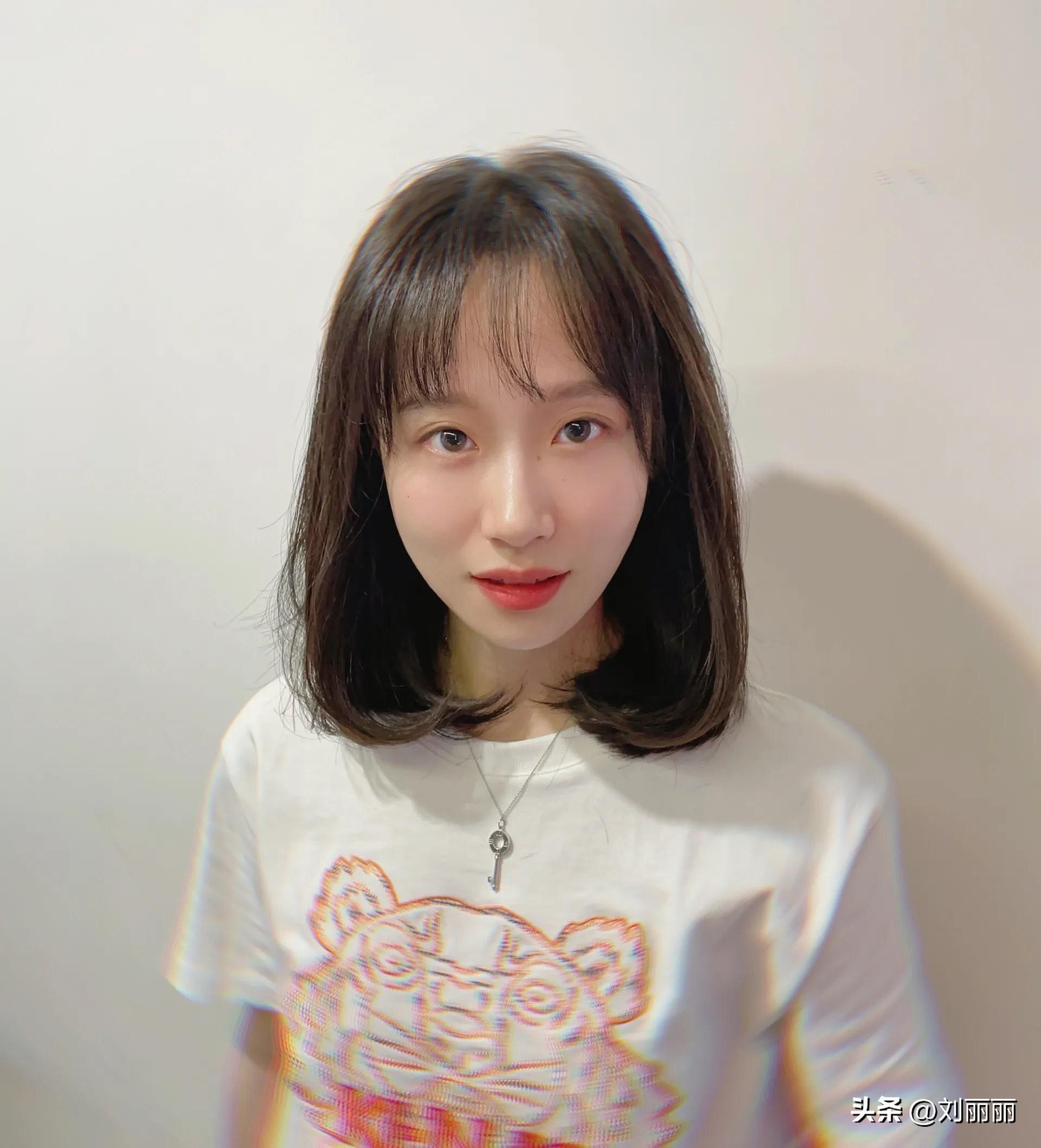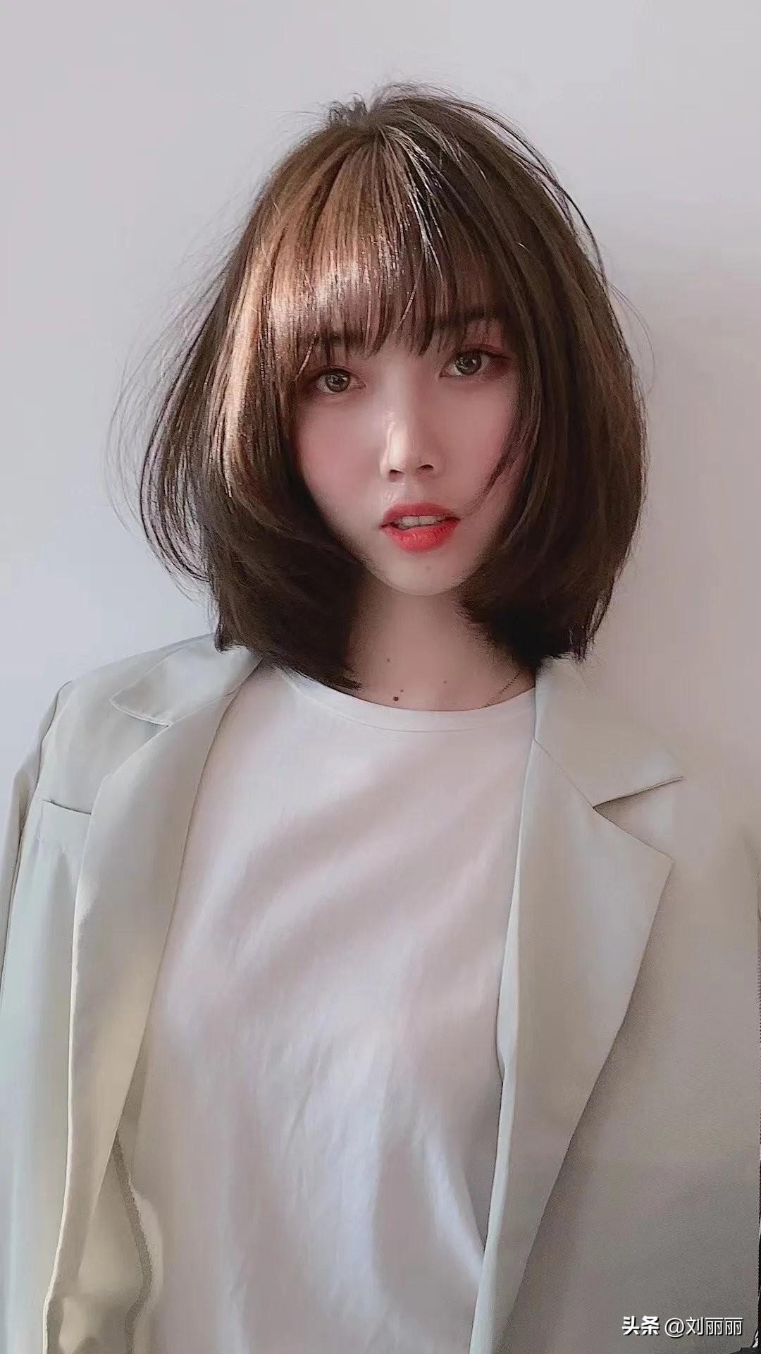 齐下巴的波波头带点内扣的果,包裹着整个脸庞,显瘦果大不一样,再配上一个齐眉刘海,经典时尚很显年轻。