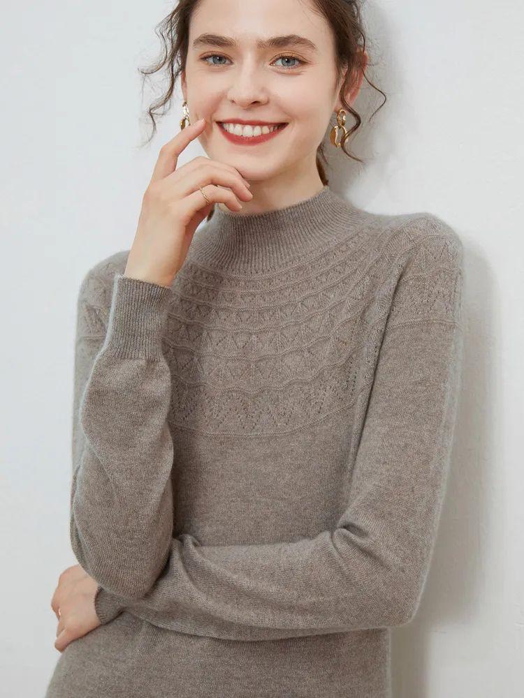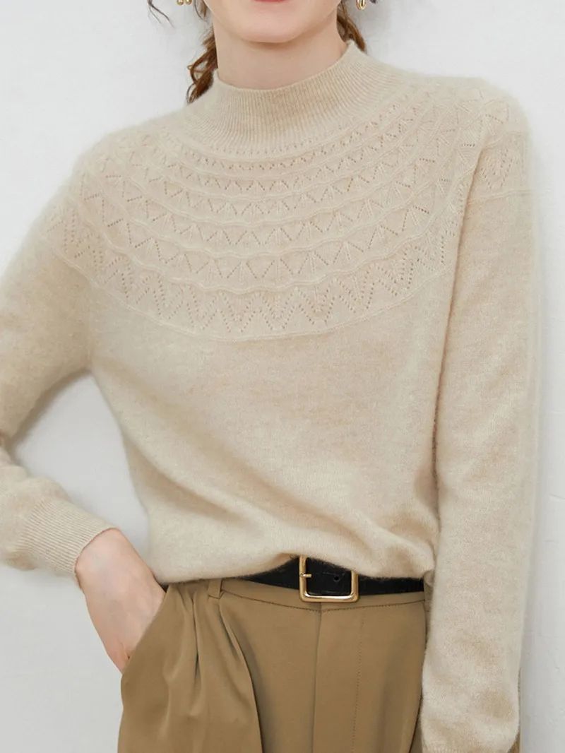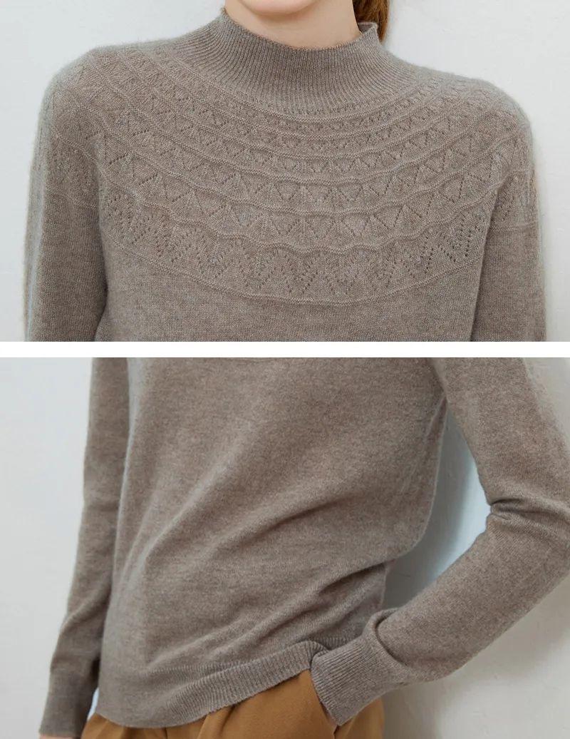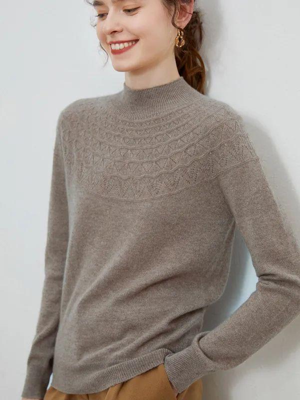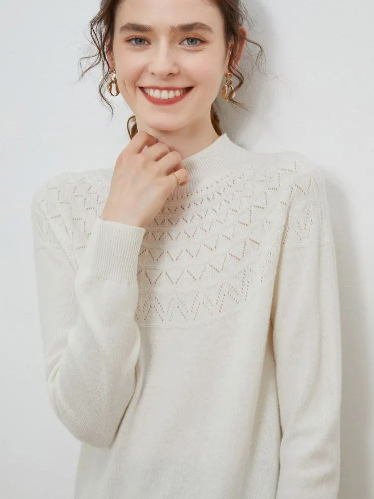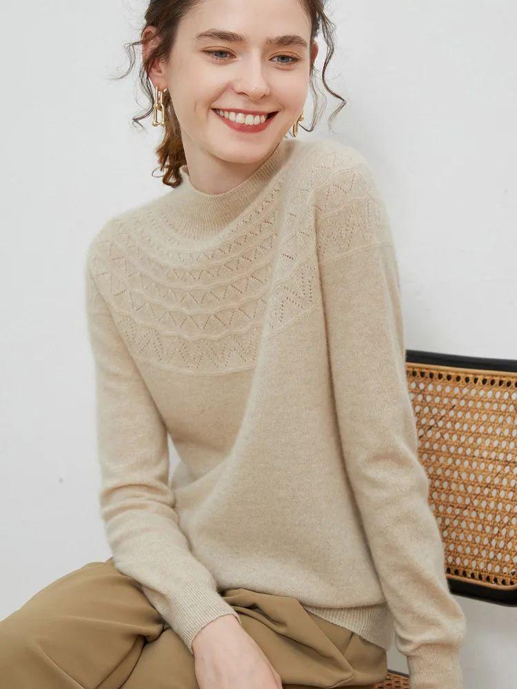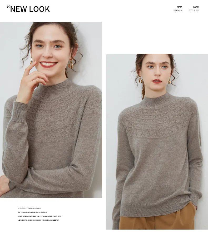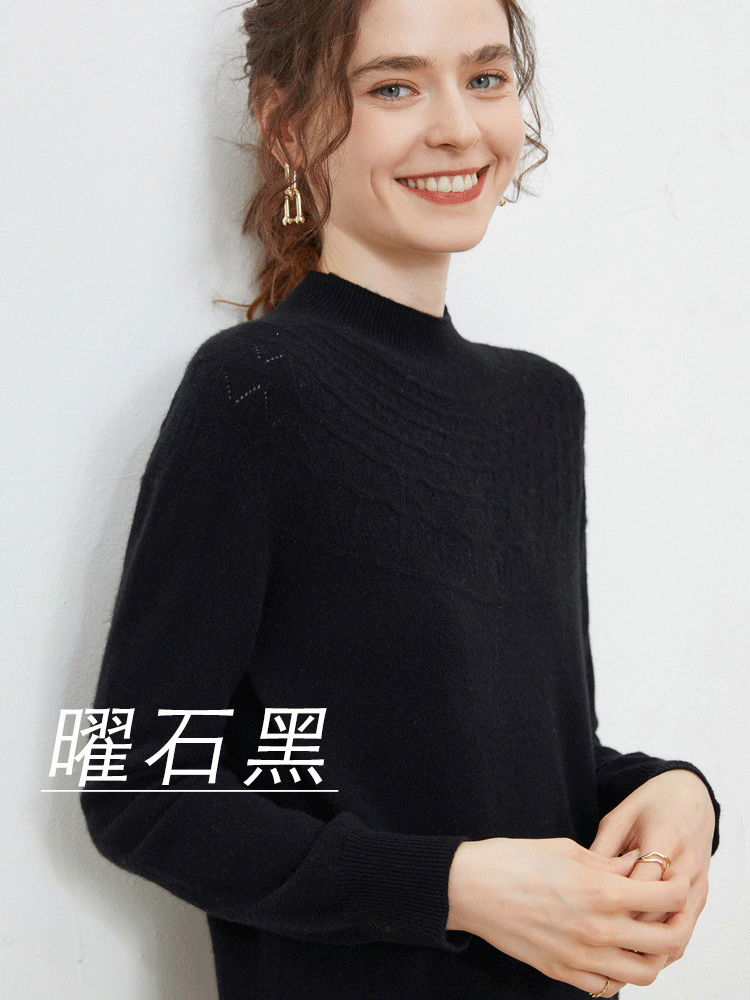 半高领领口,凸显颈部线条;镂空提花设计,简约不失格调,还打破了秋冬衣物的单调感;条纹袖口,松弛有度,修饰手部纤细感,防风保暖,穿外套也不显臃肿。