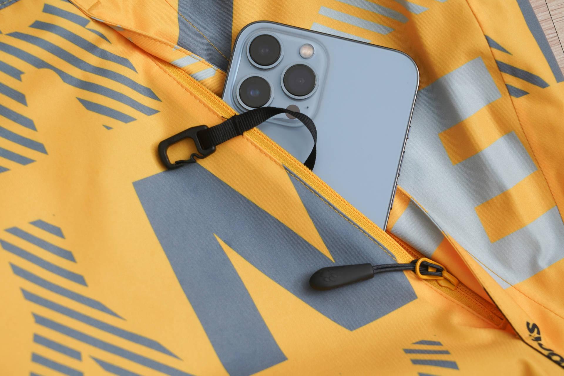 两侧的裤兜拉链外都有遮罩,就算拉链没有拉上也能一定程度防止雪灌入裤兜。兜里还有一个带挂钩的绳子可以挂俱乐部的风巾、手套、钱包等物件防止丢失。