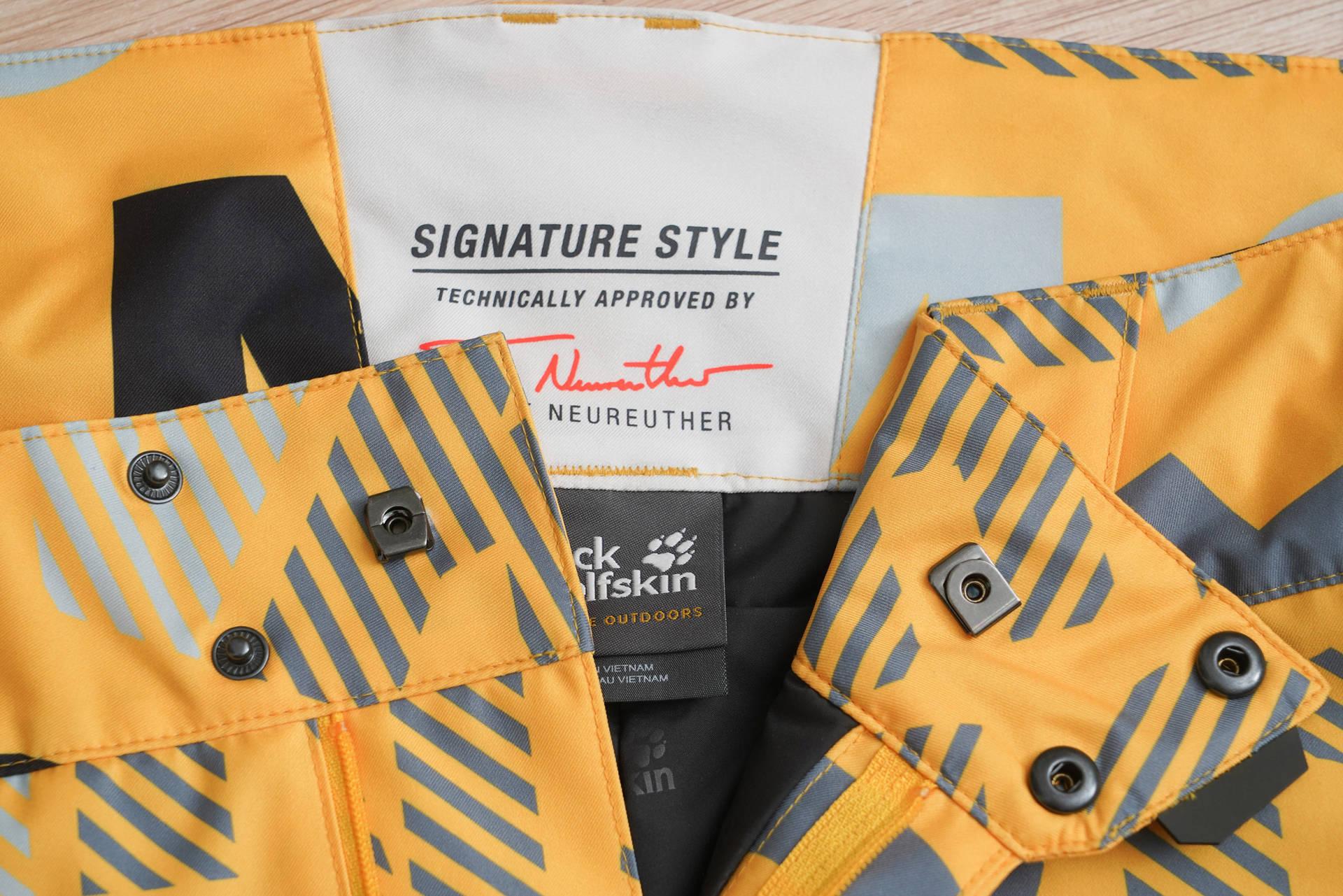 再来看看配套的雪裤。这条雪裤采用了和雪服同样的面料,就不赘述了,后腰是签名。裤子除了两个按扣以外,还有一个金属的挂钩,让裤腰更结实,不会因为摔倒导致裤腰意外松脱的尴尬局面发生。