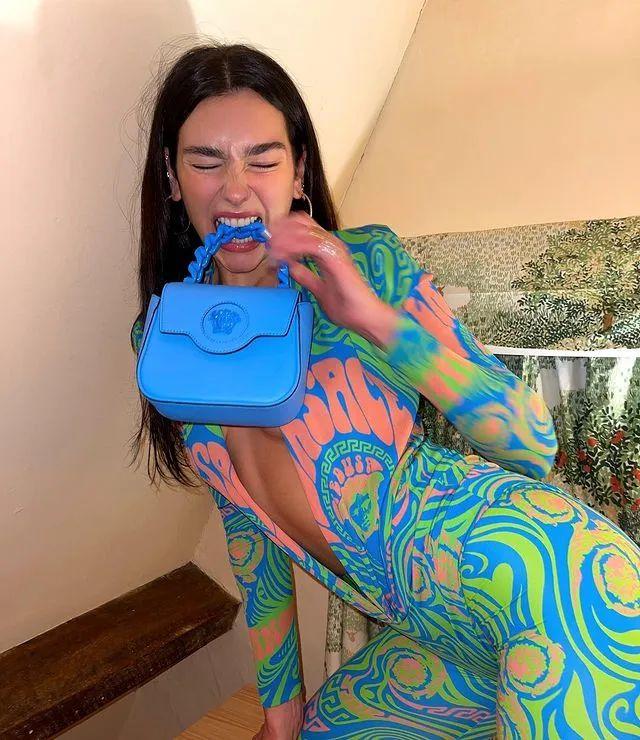 如运用荧光色系、涂鸦卡通字体的 LV SS22 ,和 Versace 近两季主打的「霓虹色调」紧身装扮,Prada FW21;