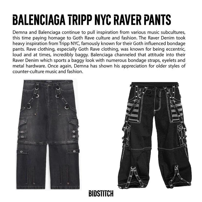 「八神裤」外,Balenciaga 近年推出的多口袋工装裤、高腰版型牛仔裤等,亦均契合着「90S 锐舞裤」的特征,并通过添加破坏果、重磅工艺,拓展创意与美学,也促使市场需求激增,不少玩家便开始「挖掘」起更早年或更经典、小众的锐舞裤。