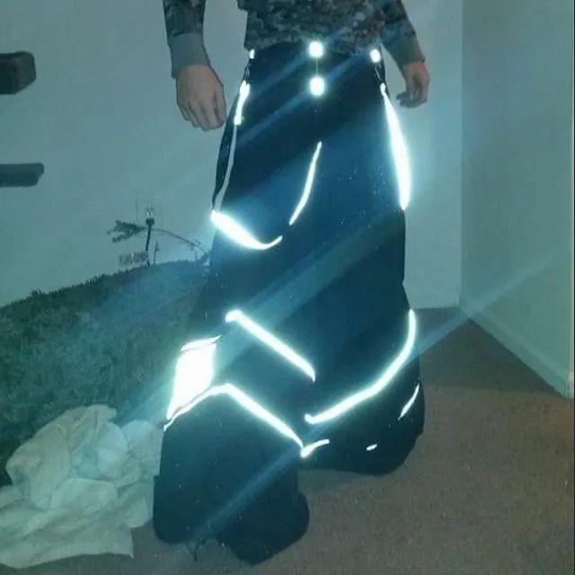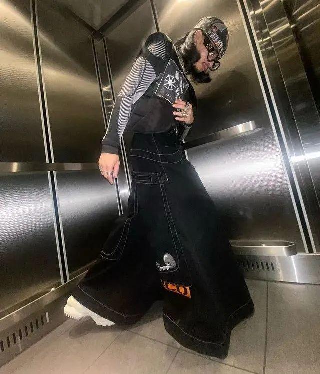 而在 90 年代与 Jnco「竞争」的品牌 Kikwear,一些设计更体现着 Rave 派对的「地下氛围」,如加入 3M 反光条,阔腿果也更接近「裙款」,市价在 100~200 刀;