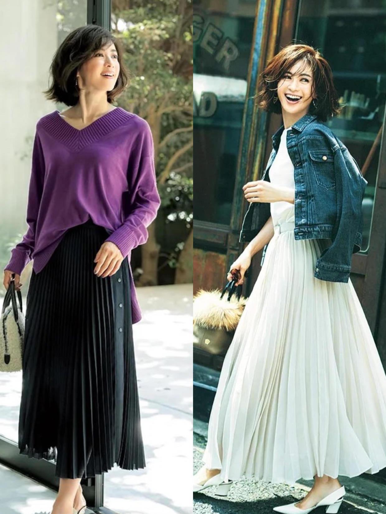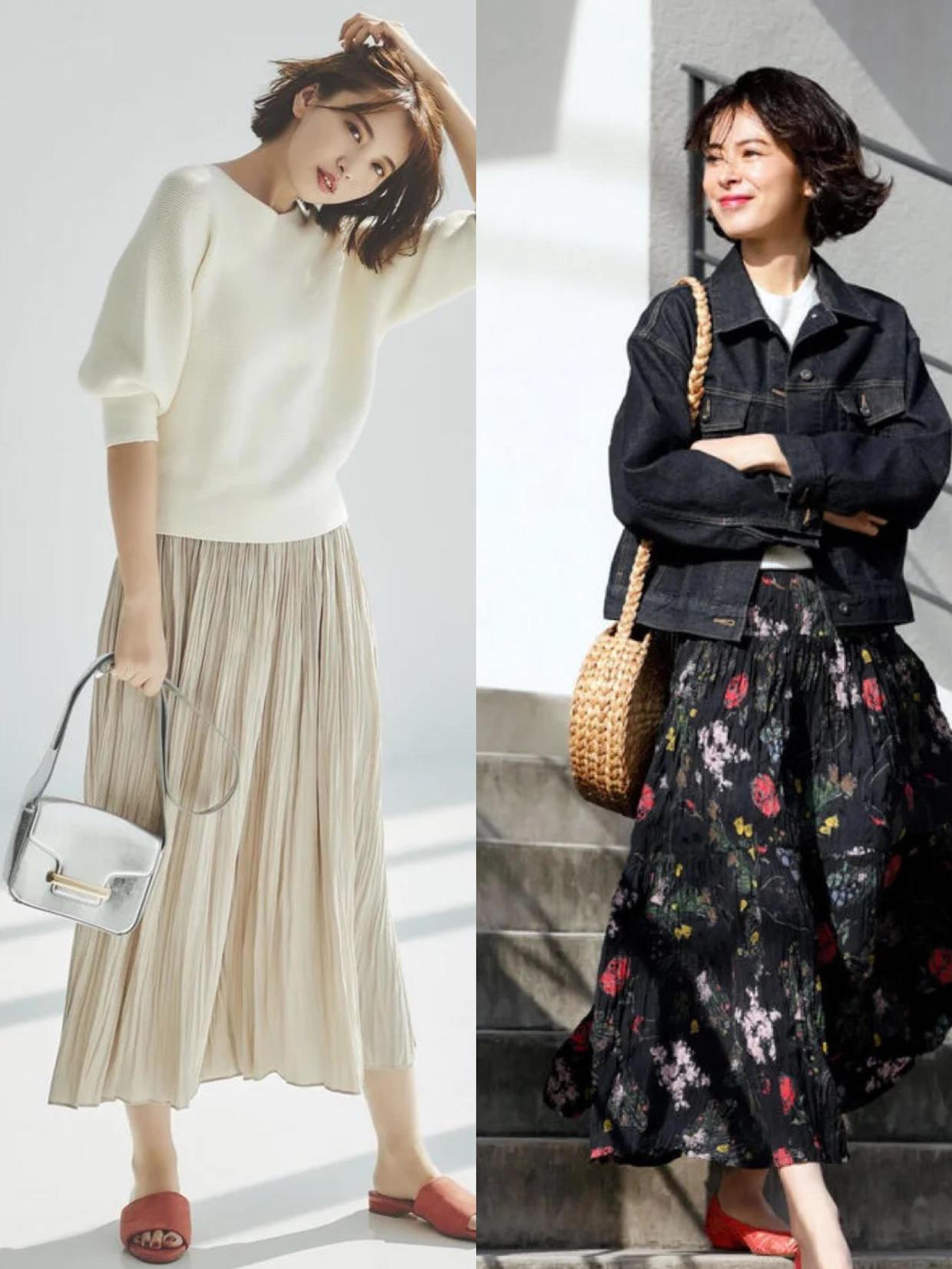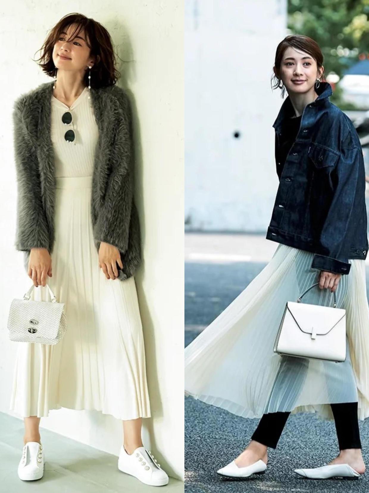 第二,高级搭配分享会穿衣的女人在秋天也喜欢尝试这些裙装,你可以给自己入手一条百褶半身裙,这也是今年很流行的单品,高腰长款百褶半身裙的搭配对于身材的修饰果挺的,通过用这种长款裙装来搭配毛衣或卫衣也都很灵动,很飘逸。