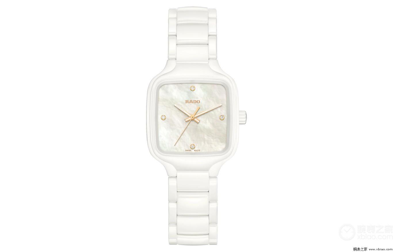 腕表点评:这只腕表给作者的感觉就是十分干净透亮,表径29毫米,整体是正方形的形状。采用雷达高科技陶瓷打造表壳和表带、表扣,也是品牌用注塑工艺,打造的一体成型高科技陶瓷方形腕表。虽然是方形,但是四个角线条很柔和,佩戴感柔和,且陶瓷材质耐划,可以佩戴很久都始终如新。表盘是由珍珠母白材质打造,搭配四颗钻石时标点缀,再加上金色的指针,整体典雅耐看。搭载一枚石英机芯,防水50米。