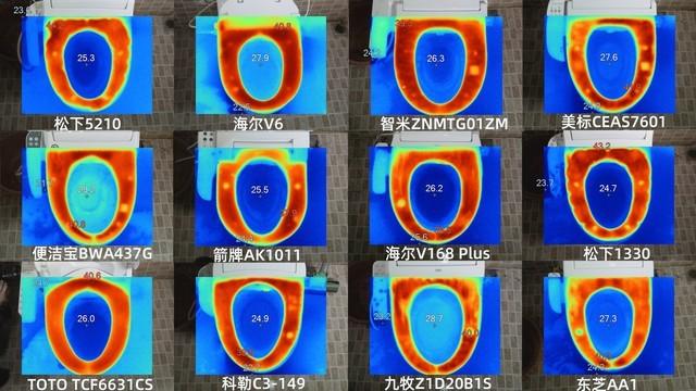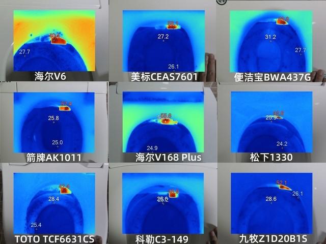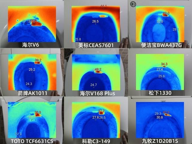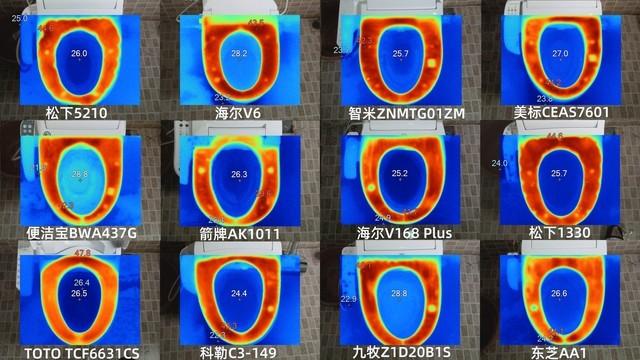 从红外热成像相机拍摄的照片来看,TOTO TCF6631CS、海尔V6的均衡性好,不均衡的是箭牌AK1011。此外,智米ZNMTG01ZM和九牧Z1D20B1S的高温区域集中在左上角,松下1330分布分散,差。