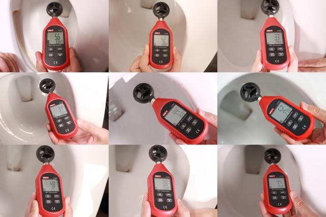 众所周知,暖风烘干的速度与风速也有关系。9款马桶盖风速是无法调节的,我们用风速计测试9款马桶盖暖风烘干的风速。