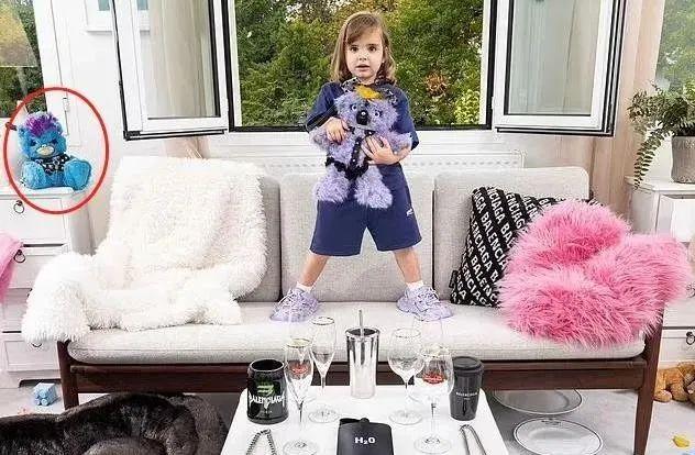 首先,孩子手上拿着大大的玩具熊,上身穿着渔网装,带着皮带捆绑装饰……