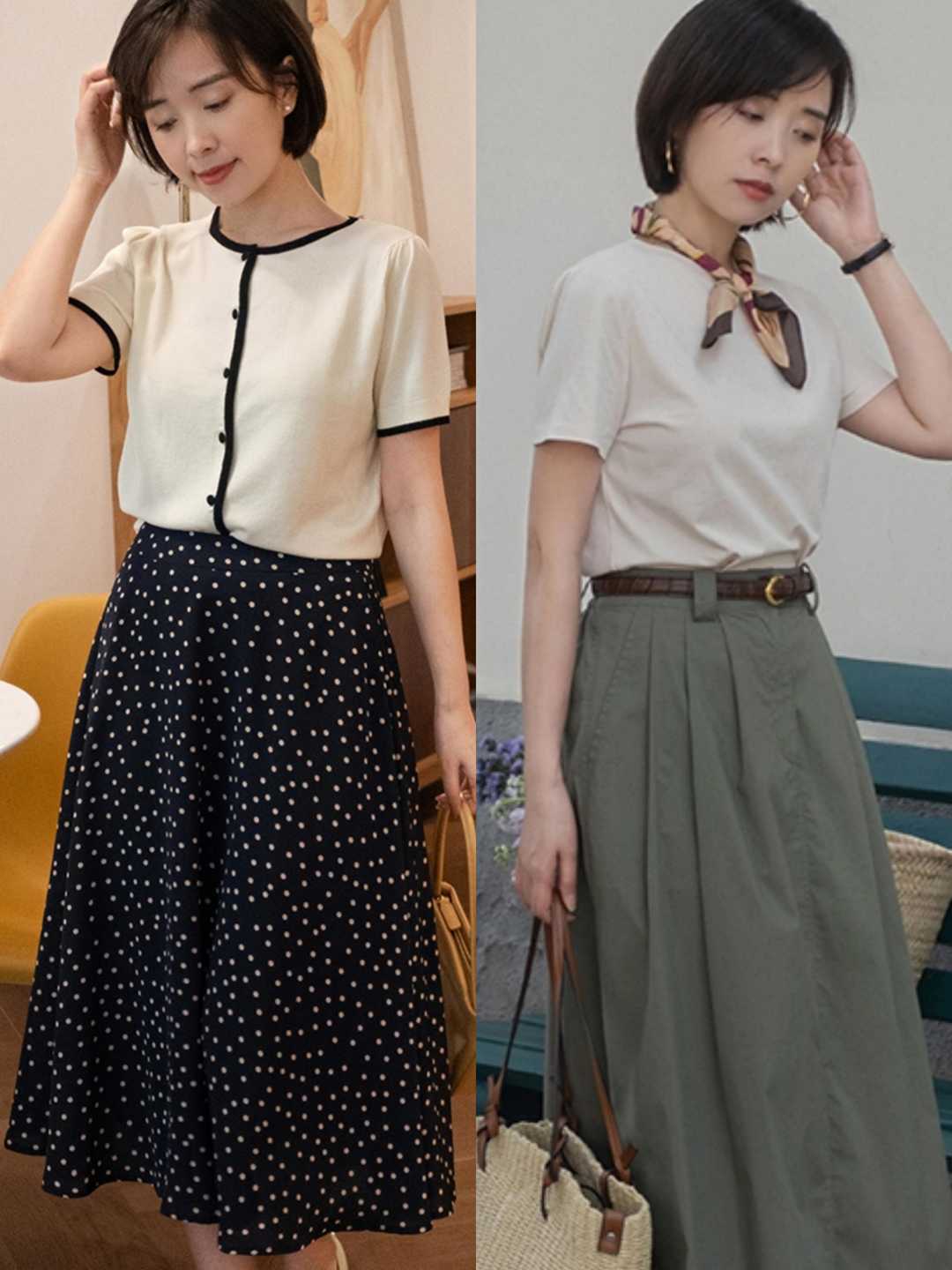 第二,搭配解析那如果要说具体的穿搭,你可以在夏天用这些温柔的半身裙来打造出好气质,这样会显得更有韵味,像下面的中长裙装穿在身上都是极其具有魅力的,看上去浪漫且知性。中长裙装搭配着针织衫也可以展现出好气质,彰显出女人味。