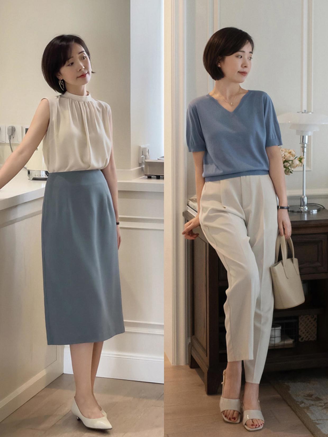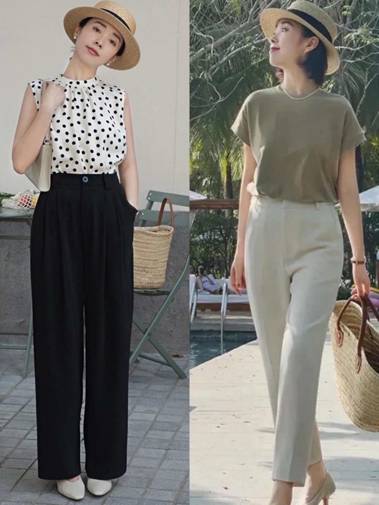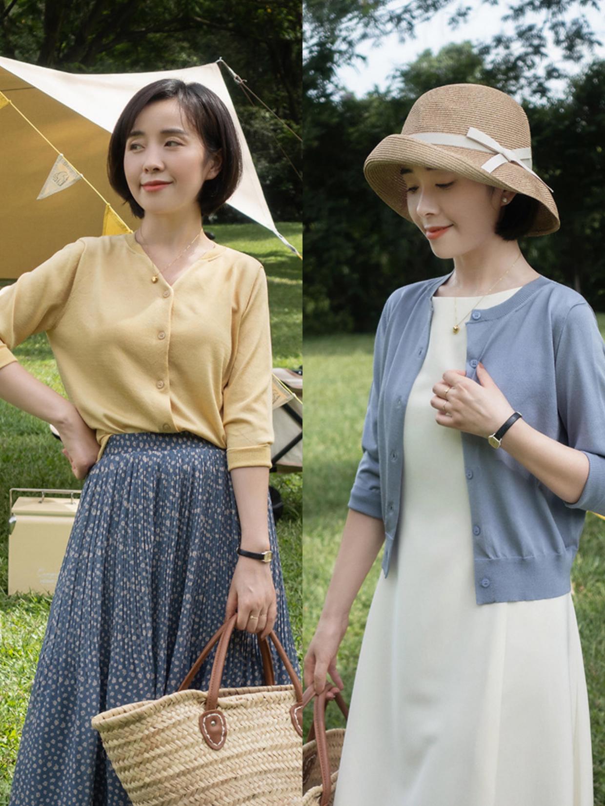 前面也讲到了色彩搭配很重要,夏日穿搭不管选T恤,衬衫还是针织衫,都可以用各种流行的色彩,就比如粉色,黄色的针织单品穿在身上也都会显得更轻盈,这些浅色的服装还特别显白,就算已经过了40岁也可以试试。