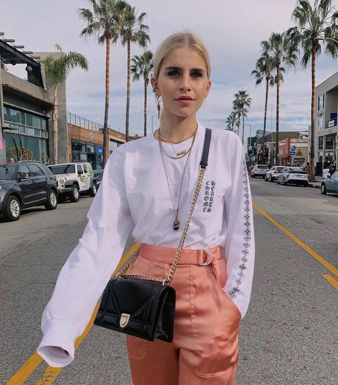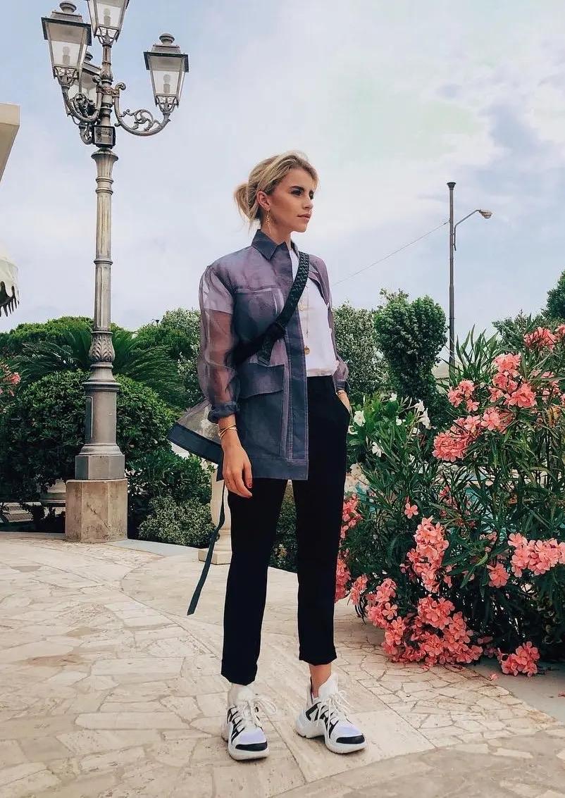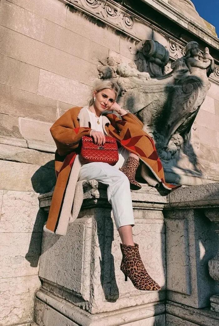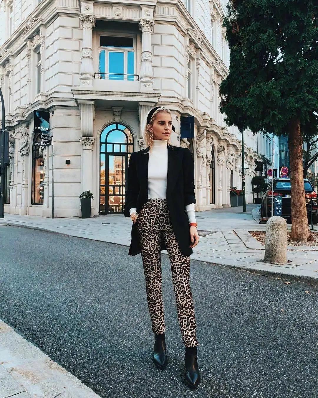 我们可以通过玩转颜色的对比,呈现出我们想要的脚踝线条,进而达到更加显高显瘦的果。比如豹纹裤子与黑色踝靴的搭配,脚踝以下统一的黑色,视觉收缩力极强,同豹纹裤形成鲜明的对比,增强了显高显瘦的果。