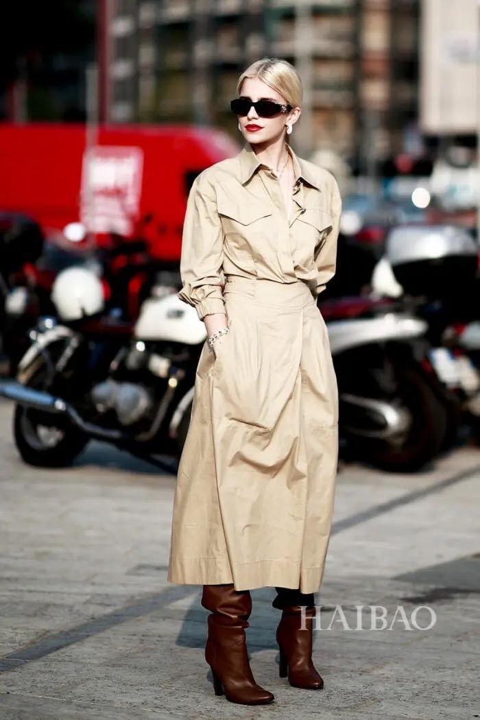 提高腰线即航第序,外面搭配长外套或者短外套,过膝靴