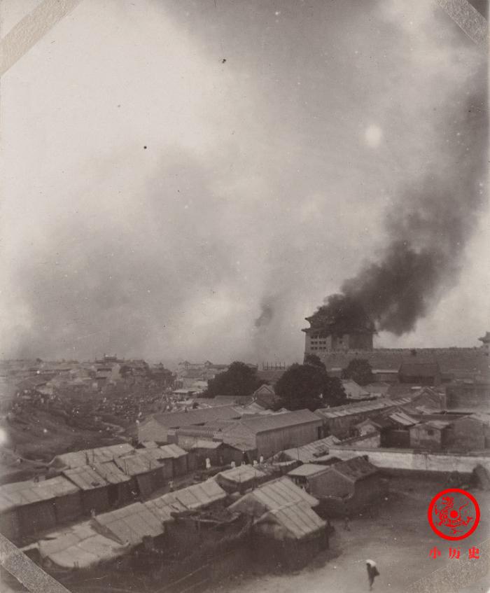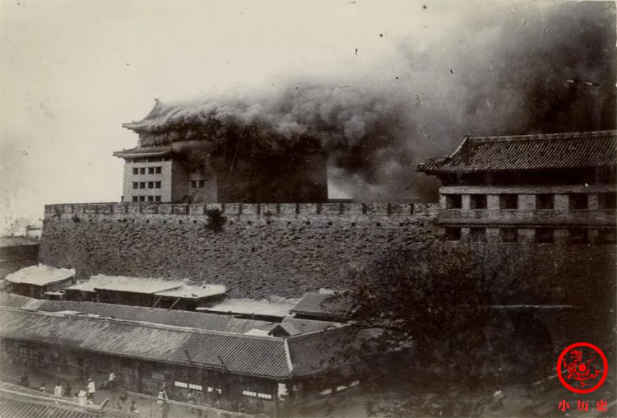 1900年6月16日,义和团为抵制洋货,火烧位于大栅栏的老德记洋货店,当时恰遇西南风,以致火势迅速蔓延,终引燃前门箭楼。《庚子国变记》记载道:“(义和团)焚正阳门外四千余家,京师富商所集也,数百年精华尽矣。延及城阙,火光烛天,三日不灭。”当时有摄影师记录了这一幕,十分难得。