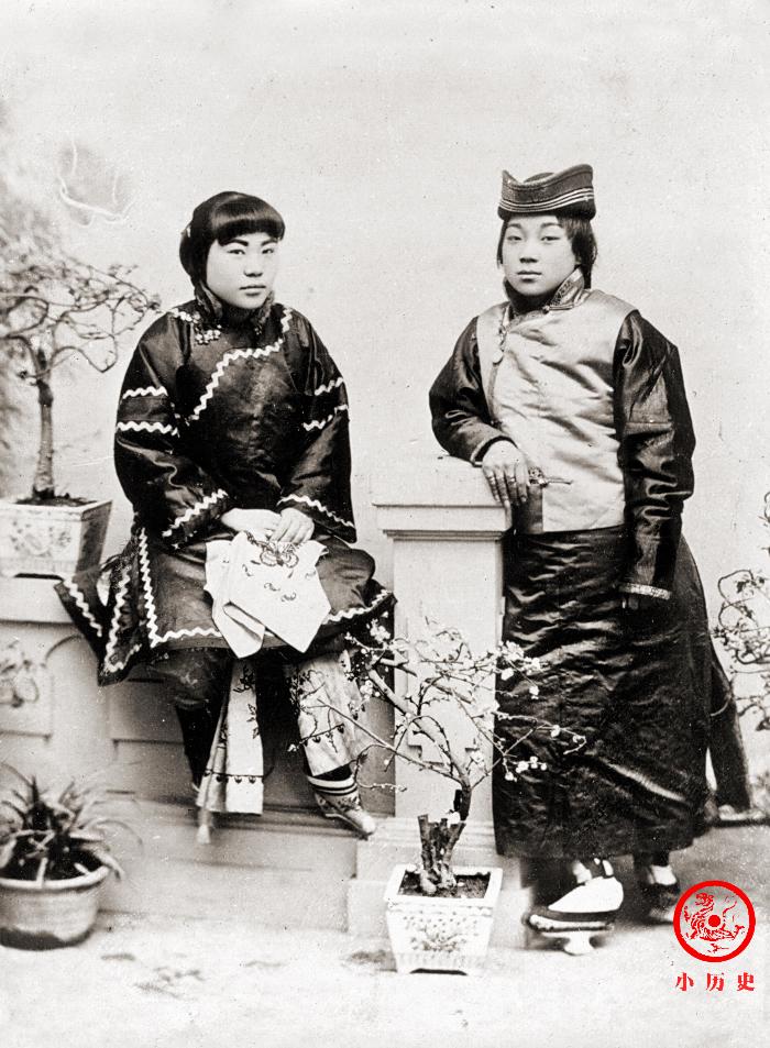 两位年轻女子面容清秀,气质不凡,但着装风格大异其趣,左侧女子裹小脚、穿袄裤、留刘海,一副追求时尚的打扮,娇柔妩媚;右侧女子着男装、穿旗鞋,多了几分英武之气。