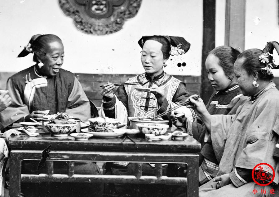 旗人妇女围坐在八仙桌上吃饭,桌上摆着丰盛的饭菜。左二穿着为华美的那位正在吃菜,大家请注意她的动作,用筷子将菜送入口的同时,另一只手举起小碟子,以免汤汁洒落,小心翼翼,可以说优雅、讲究礼仪。