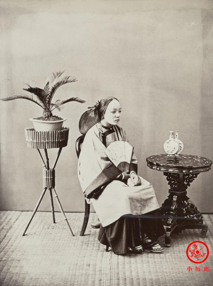 这位年轻女子穿着袄裙、裹着小脚、手持折扇和手绢,45度角对着镜头拍照,展现了美的一面。她的发型略显夸张,犹如升起的船帆,因而得名“帆船髻”,流行于清朝中晚期东南沿海一带的妇女中。有学者认为,妇女通过梳“帆船髻”来表达对出海亲人的精神寄托,祈求平安。