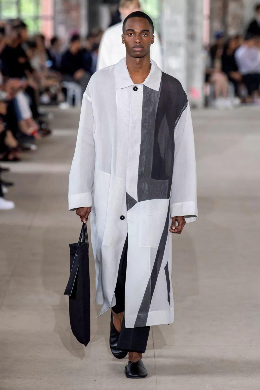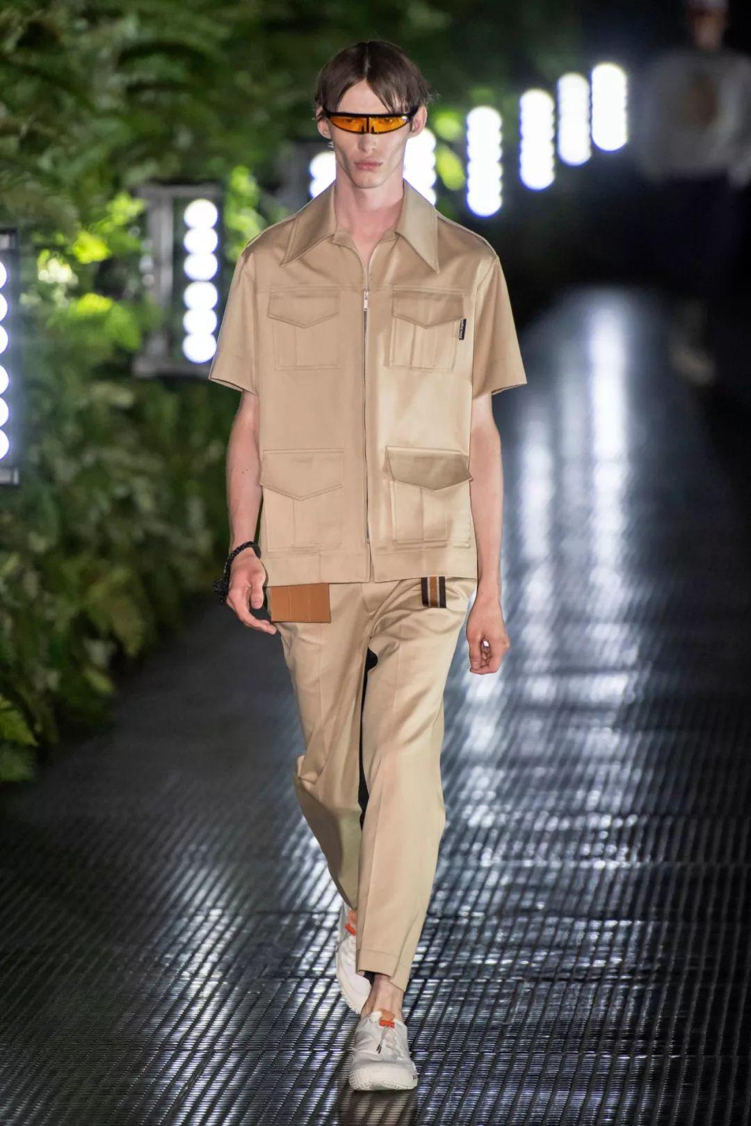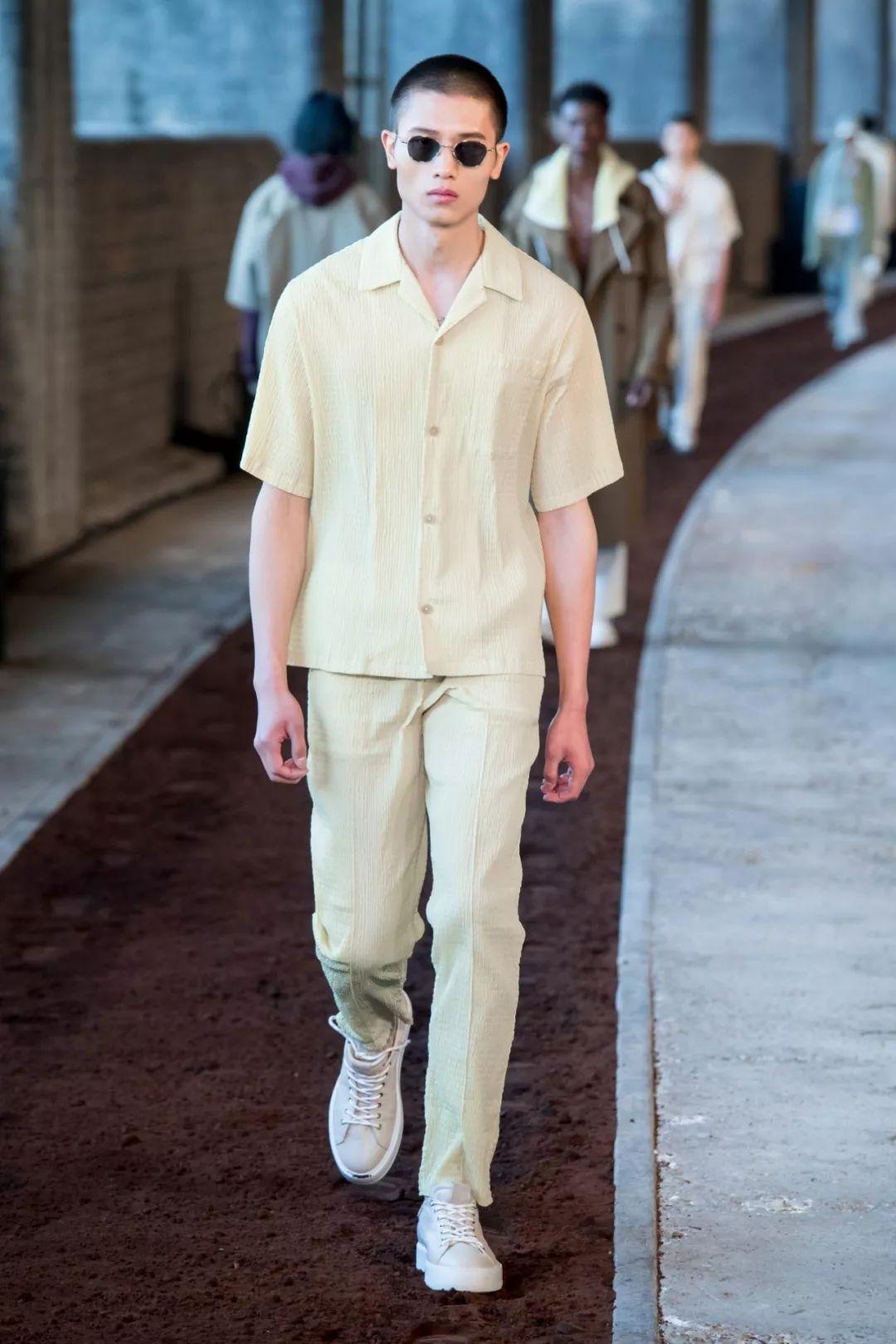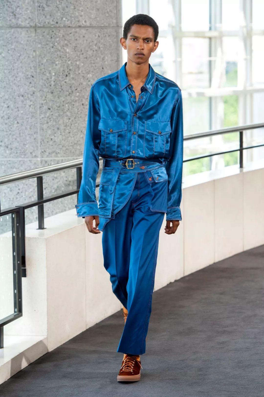 2020春夏男士T台流行使用奢华绸缎,典型的就是绸缎西装。褶皱表面纹理和失真表面纹理被用于许多底料,可以用高级中性色的优雅棉制平纹布展现高级实用性。