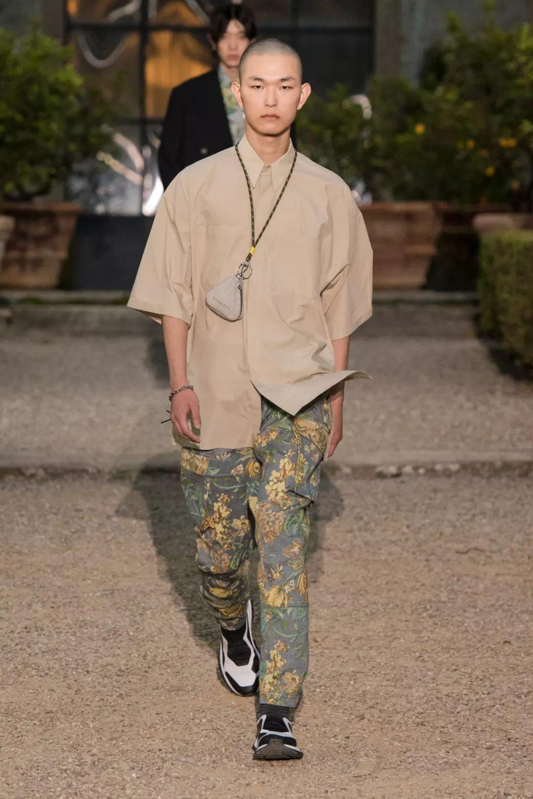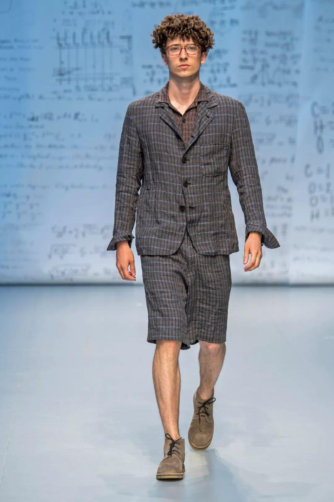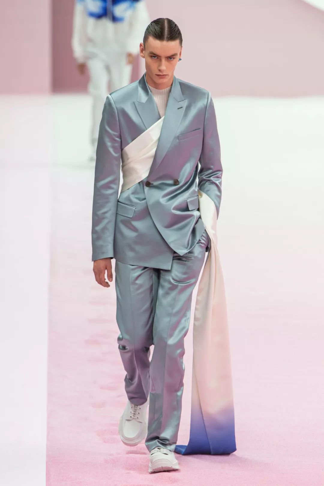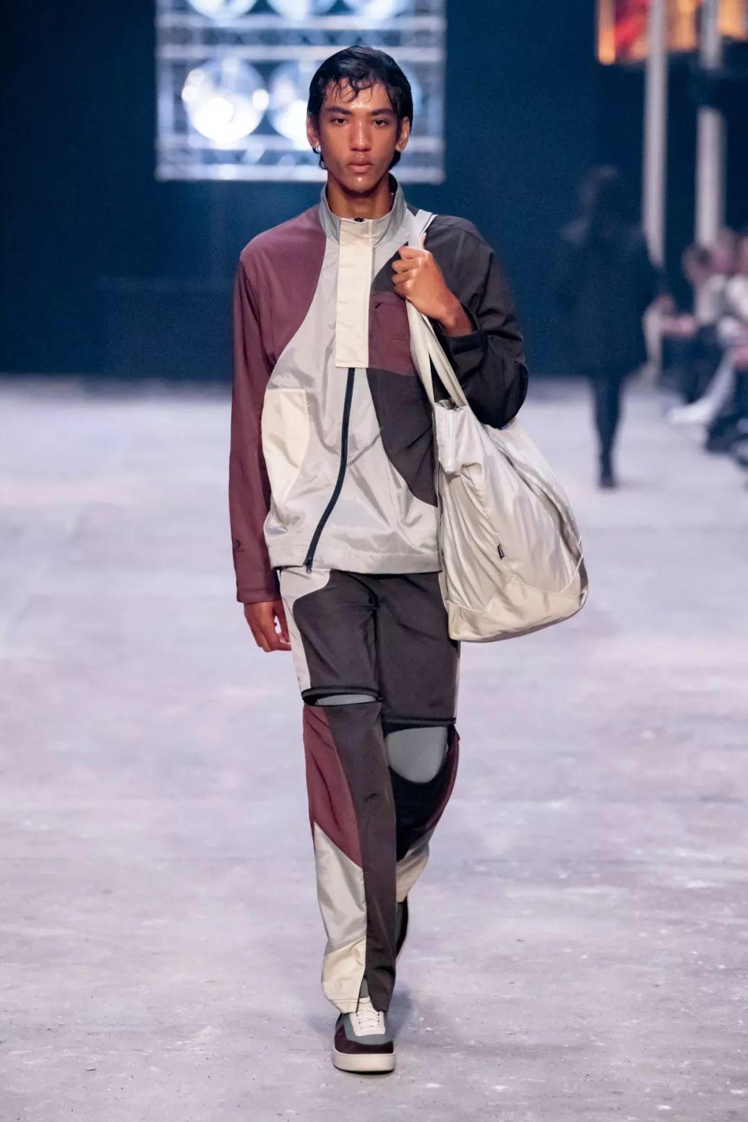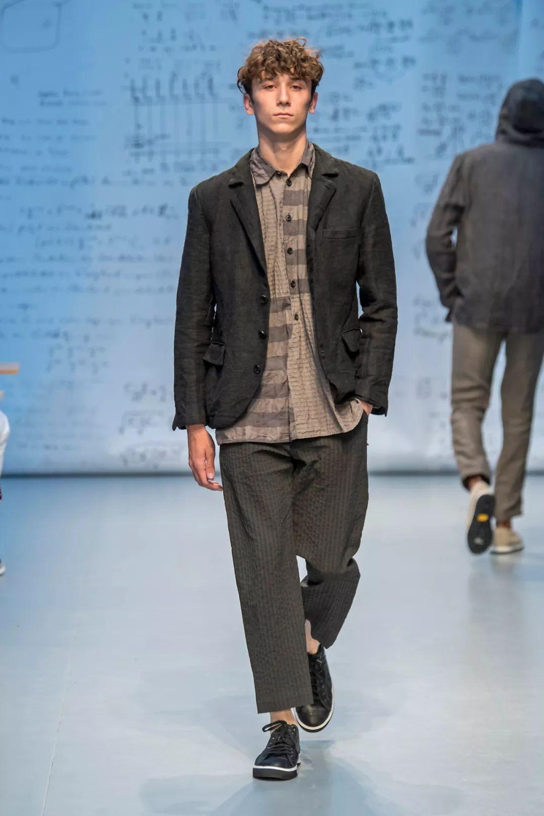 2020春夏男士T台流行使用奢华绸缎,典型的就是绸缎西装。褶皱表面纹理和失真表面纹理被用于许多底料,可以用高级中性色的优雅棉制平纹布展现高级实用性。