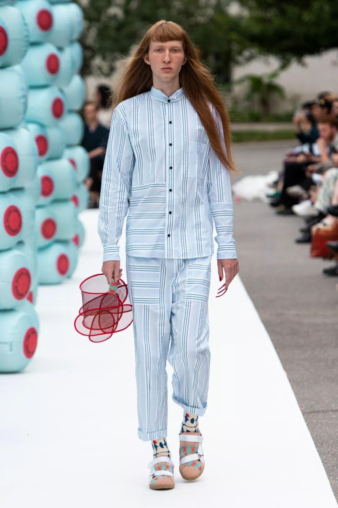 阴影条纹、坚质条纹、粗细不一的竖细条纹采用了应季配色,搭配浅底色时十分新潮,泡泡纱和绉纱为服装增添纹理,营造失真果。