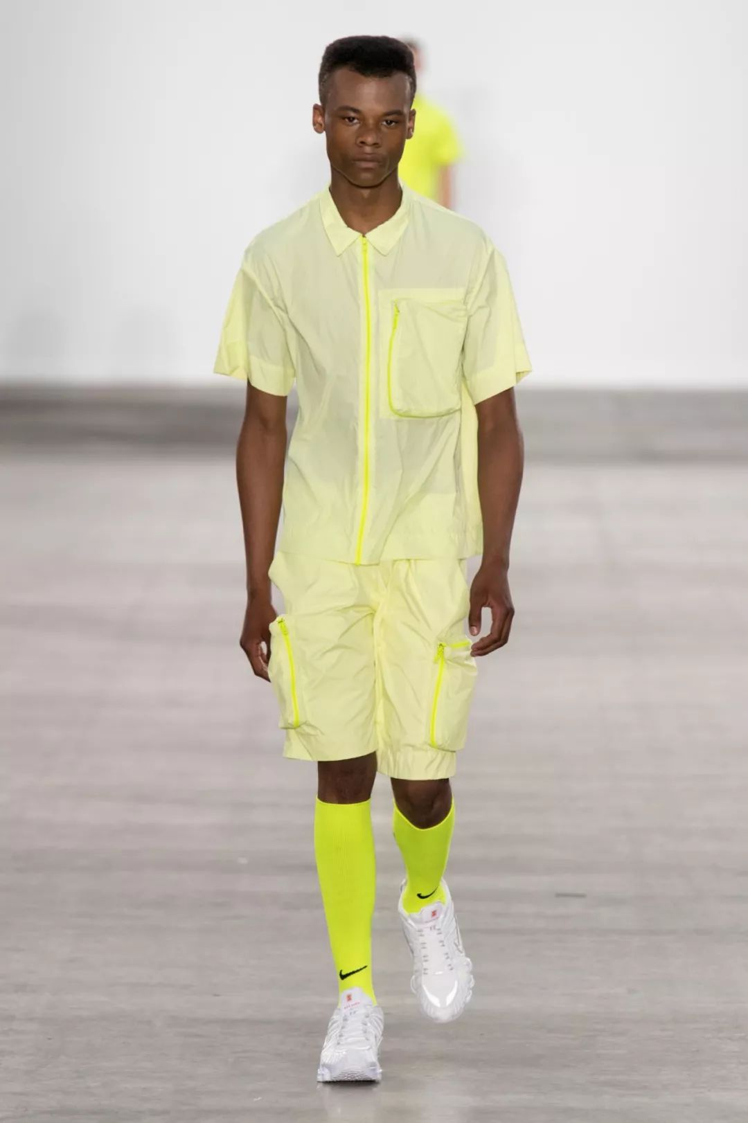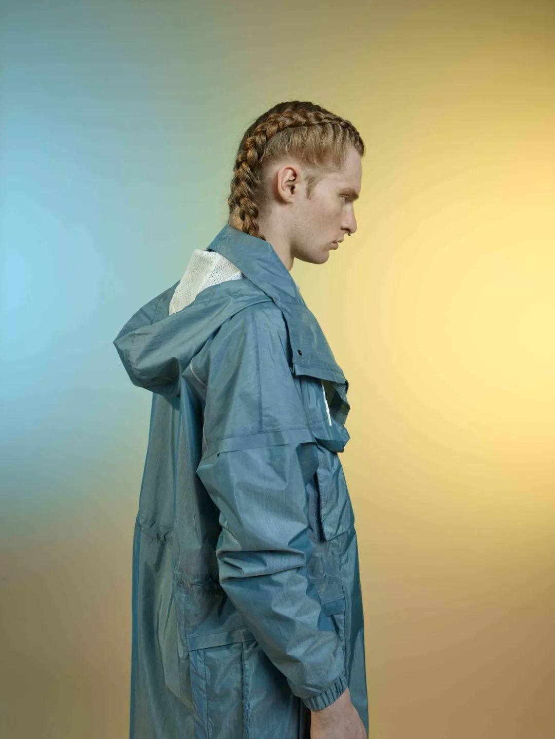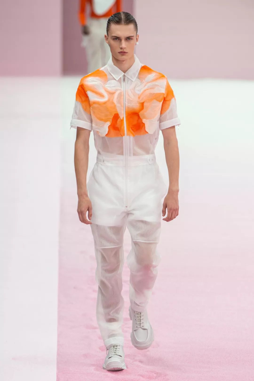 薄透超轻科技面料不再只适用于外套,也被用于全身造型。半透明薄纱跨入其他领域,例如薄透衬衫。