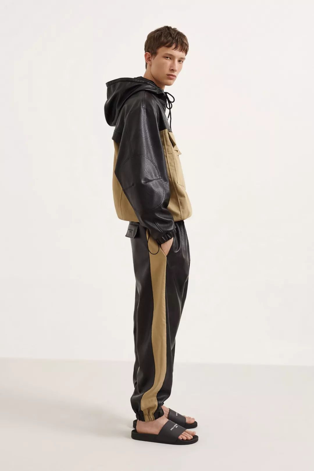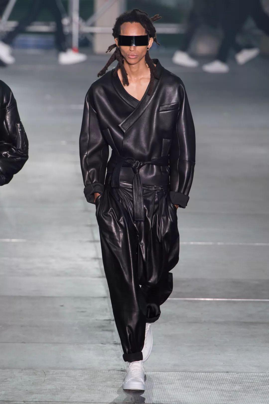 用延展性皮革和人造皮革搭配出全身造型