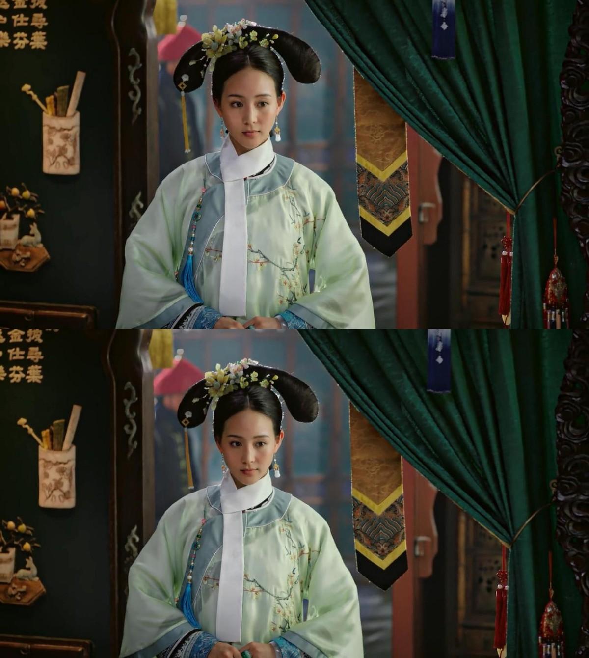 这一套同样是两把头的造型,海兰陪渣龙从圆明园回来后,换上了一件蔻梢绿的常服,逆袭后的海兰眼神都变得自信多了,造型也更加鲜艳明亮,像一朵水仙花。