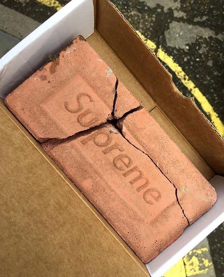 2016年推出的Supreme砖头是可以在工地使用的真正的砖头。砖头一上市就被抢购一空,至今仍作为收藏品大受欢迎。