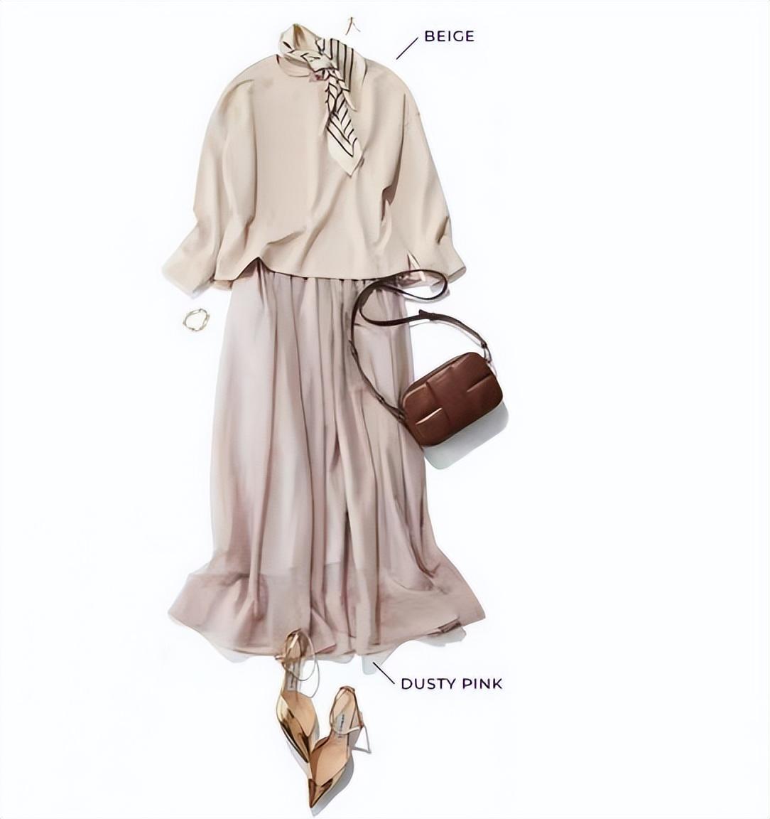 米色与灰粉色打造的同色系,是多么地雅致讲究!为了制造冲突,金色高跟鞋与棕色包包,一唱一和,点缀得尤为应景。