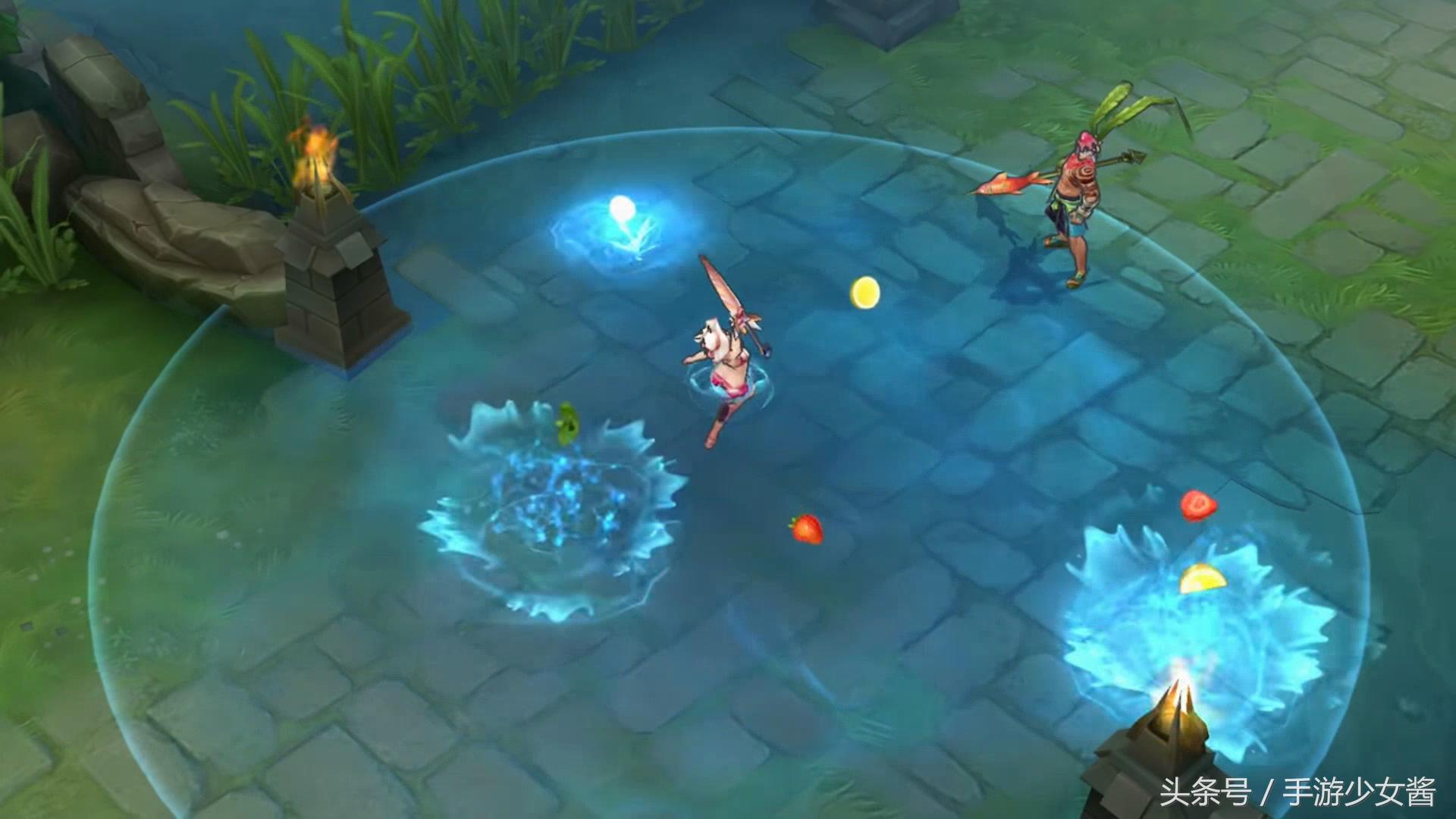 二技能释放的时候是弹起巨大的水花之后,紧跟着随机蹦出一种水果(草莓、柠檬等),并冰冻住敌人。而貂蝉的大招就更漂亮了,是在地上弹起三个水花的同时,施法的范围区域会有很多鲜果落下,是不是看起来夏季的清爽感十足呢?貂蝉的普通攻击则是喷出一道小水柱,看起来分外的清凉。