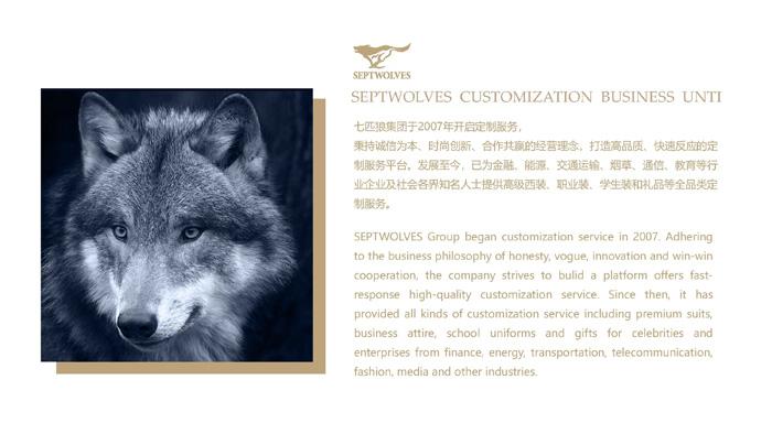 福建七匹狼实业股份有限公司于2007年开启定制服务,秉承诚信为本、时尚创新、合作共赢的经营理念,打造高品质、快速反应的服装定制服务平台。发展至今,已为金融、能源、交通运输、烟草、通信、教育等行业企业及社会各界知名人士提供高级西装、职业装、学生装和礼品等全品类定制服务。匹狼率行业之先导入CIS系统,引入特许经营。采取直营销售与特许加盟相结合的渠道管理模式,通过缜密的ERP营销信息管理、科学的营销培训以及适时的营销服务,与全国的合作伙伴形成良好的沟通与良性的互动,构建起互惠互济的共赢体。