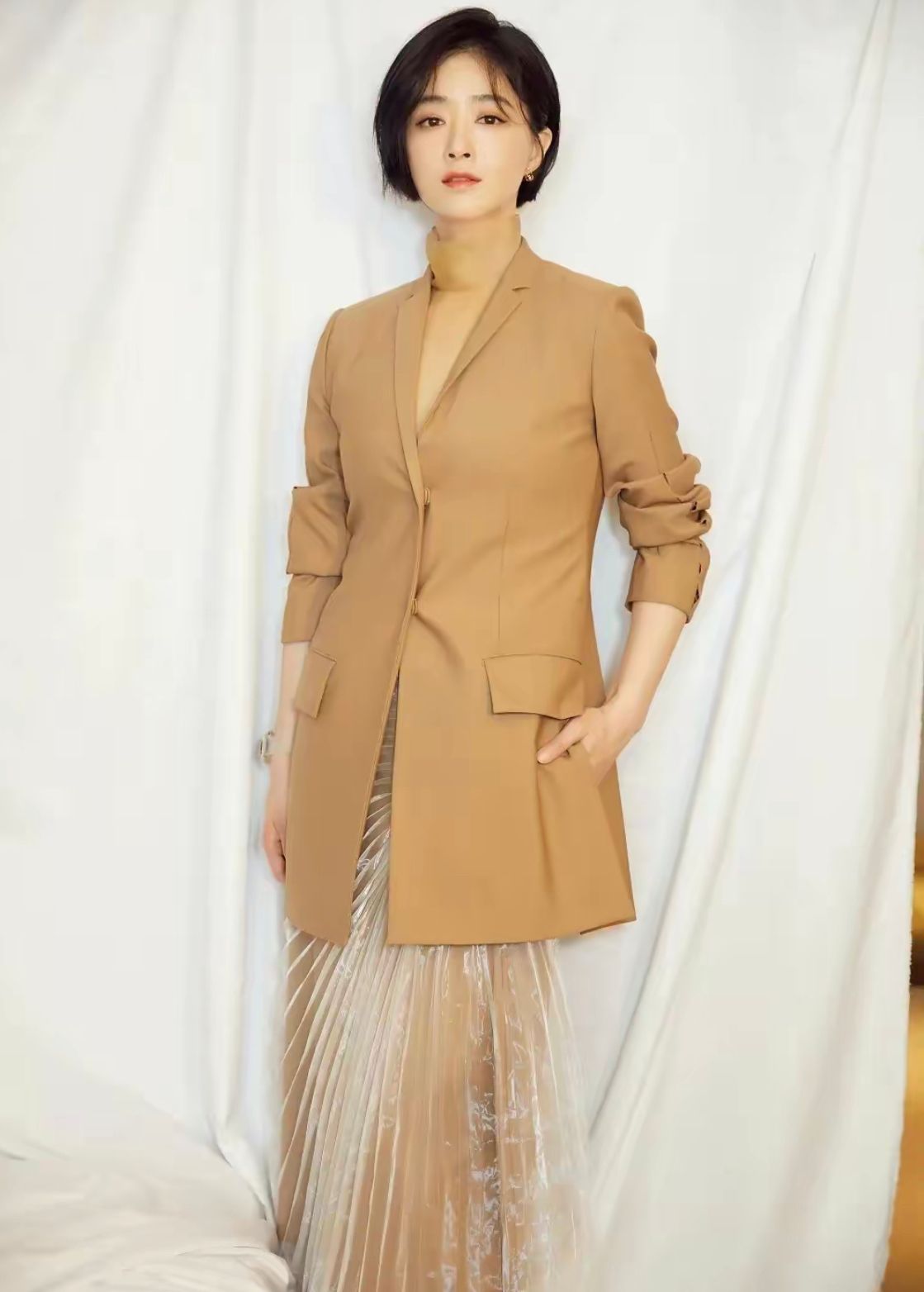 像这种西装外套的话,就不要轻易的尝试短款或者是廓形版型了,带点修身果的款式,一定可以更好的穿出干练利落的果。其实大骨架的女性,在驾驭这种西装单品的时候,反而更加具备优势,无论是日常通勤皆可穿,潇洒又帅气很大方。