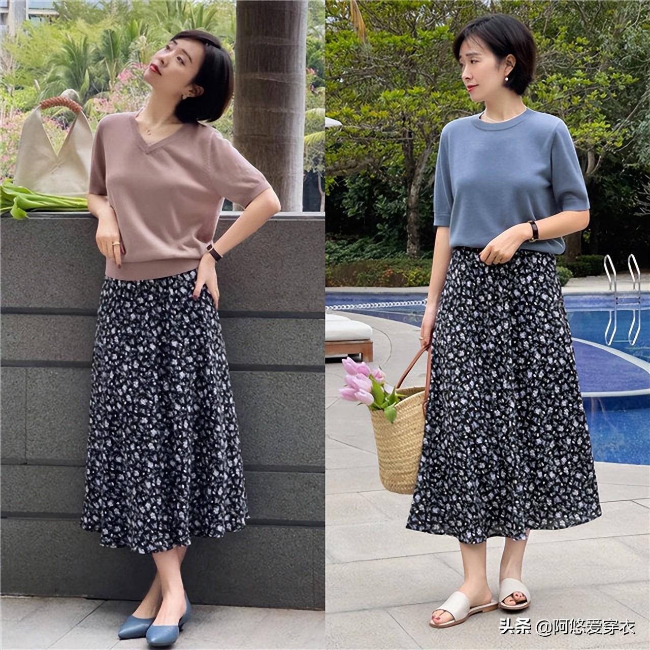 首先对于那些年龄过了40岁的女性来说,挑选裙子的第一步就是要选择合适的长度,合适的长度,意味着能够帮助我们扬长避短,并且不会压低身高,适中的程度就是在脚踝到小腿中间这一节,能够刚好把我们身材胖的地方给遮住,并凸显瘦的地方,而且把纤细的脚踝给展现出来了,自然就能够显瘦。