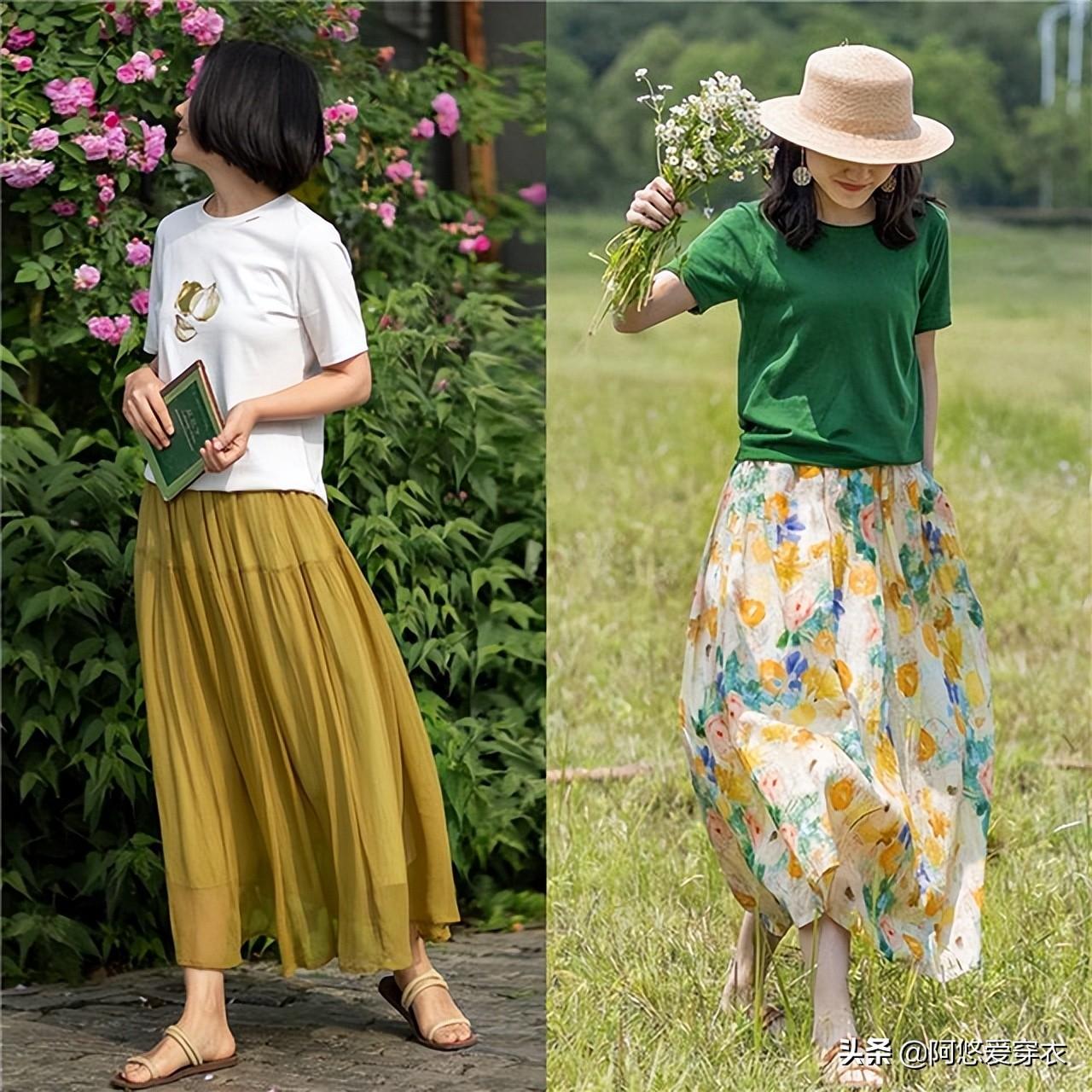 当然,像很多人在用T恤配半身裙的时候,也会在颜色上有呼应,这样穿才会觉得更美,像这种橘色裙装搭配着橘色的T恤,大地色的T恤配上具有大地色花色的碎花裙也都能够演绎出满满的时尚感,风格更为浪漫。
