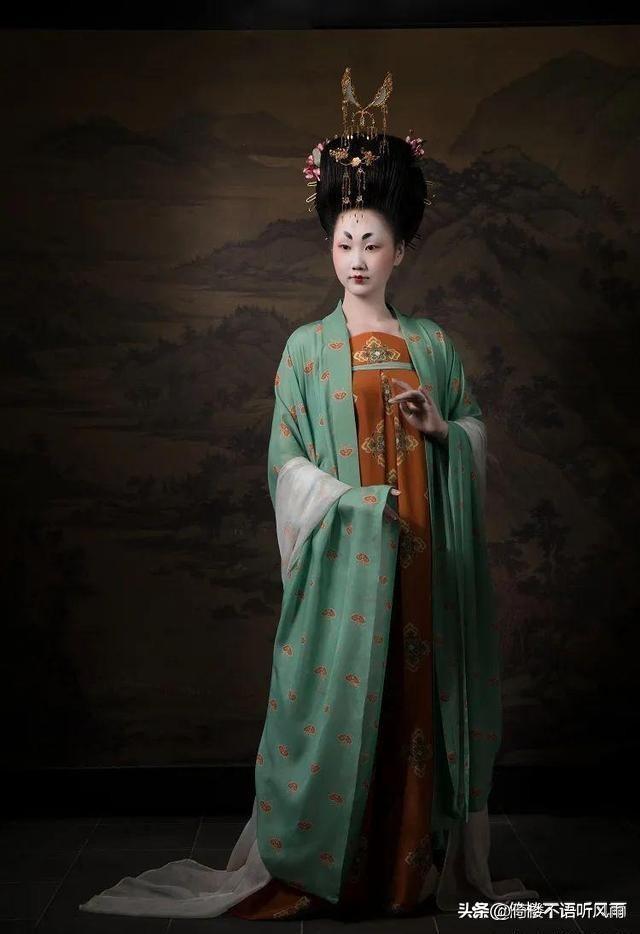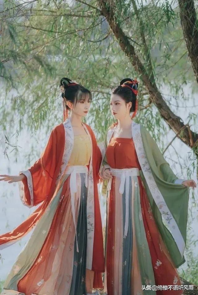 唐朝初唐时期,服装配色多为月牙,天青等清雅素净色,配上短襦小袖,显得身材修长。盛唐时期女装色彩丰富艳丽,红、黄、绿、蓝等居多,体现盛唐时期女性自由,欢快的精神。晚唐时期,女装色彩搭配多为褐色、蓝色、青色等。