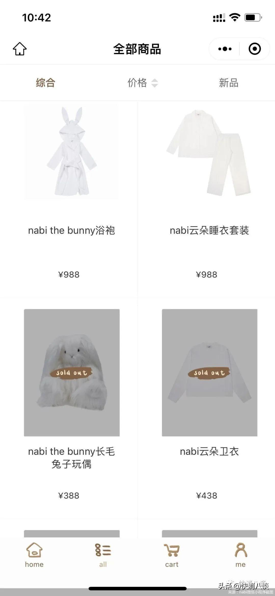 日前,欧阳娜娜推出自创品牌“nabi”,陆续在微信小程序、小红书、微博等平台开设账号。并于11月22日正式发售了“云朵胶囊系列”,共8个单品,包括988元的浴袍、988元的睡衣、388元的围巾、168元的袜子等。