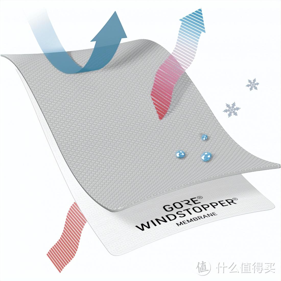 GORE-TEX INFINIUM™ WINDSTOPPER®产品采用超轻薄保护层和轻便的纺织面料,其薄膜拥有数十亿个微孔,比起水蒸气分子大900倍,能够排出人体的汗气,风是无法进入的,防风性能极好。该系列的大多数产品还在面料表面使用了DWR防泼水技术,能够让雨水形成水珠滚落,达到一定的防水性。