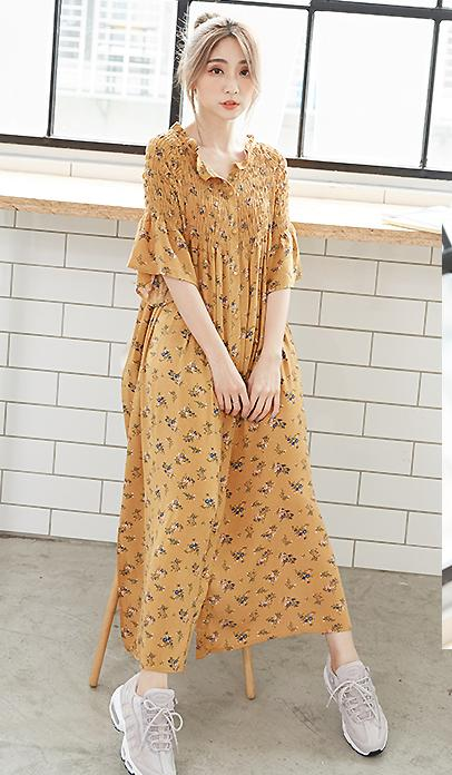荷叶边的领口,搭配亮色系,长裙搭配运动鞋,不失休闲风