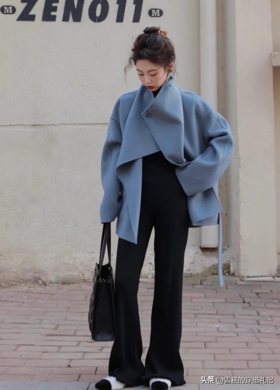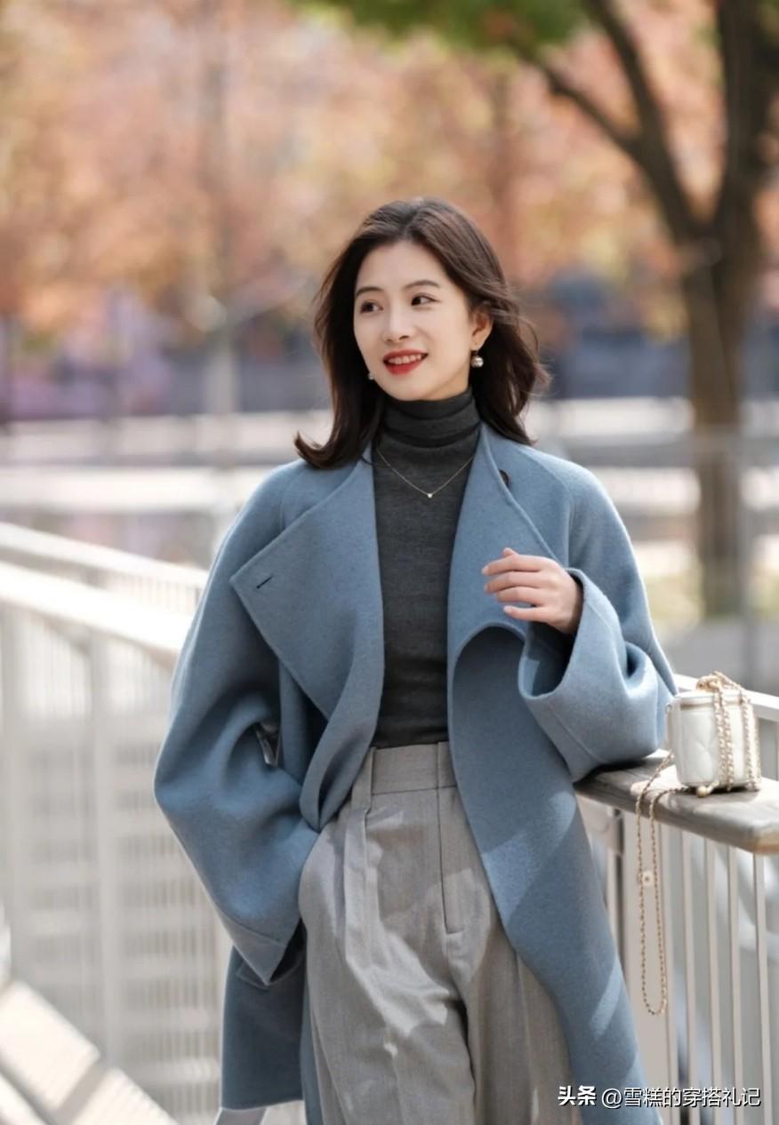 雾霾蓝的单品建议大家不要选择休闲的款式搭配,会降低一定的高级衬托性,像西装裙或者大衣这样比较硬朗型的单品更适合展现雾霾蓝的优势衬托,尤其是在秋冬的季节,这些一定是优选项!