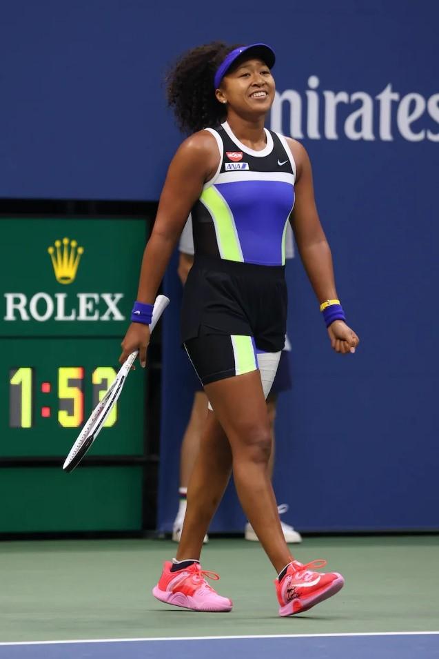 8.大阪直美2020 年美网的佳造型之一是一件拼色短裤套装,它由耐克设计,采用黑色、霓虹绿和紫色拼色,并外搭一条黑色短裤。