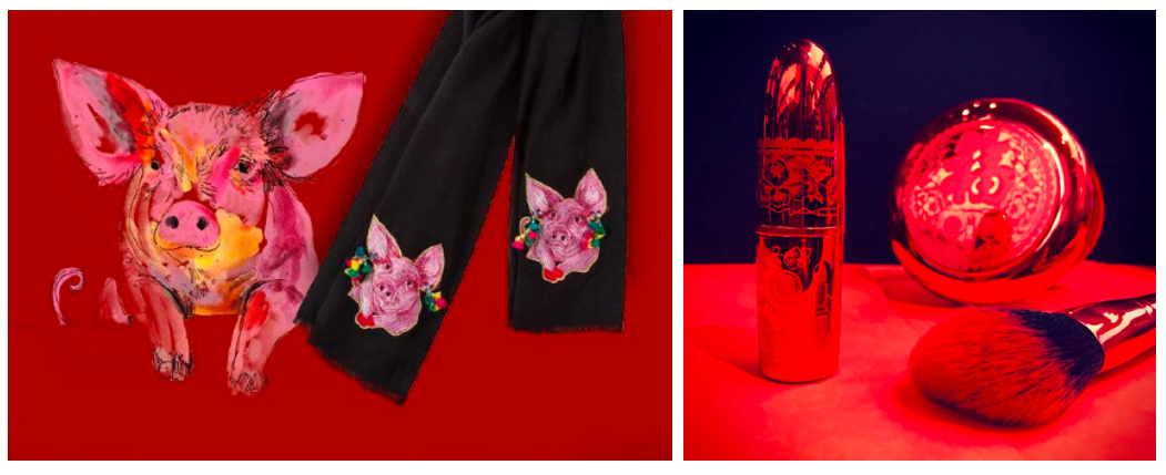 以猪年为例,不少网友表示,一些品品牌的新年限定款简直让人“笑出猪叫”:英国品牌Paul Smith直接把写实的彩色猪头印在黑色围巾上,简直无人能Hold住一只实体猪的气场;MAC猪年限定款的大红窗花和福字,堪比乡村爱情的结婚现场;Burberry的全家福广告片,色调低沉,模特们面无表情,动作疏离,缺少阖家团圆的氛围。