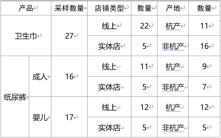 卫生用品主要包括卫生巾(卫生护垫)和纸尿裤(成人和婴儿)两大类,参与质量比对的60批次产品中,其中卫生巾27批次、纸尿裤33批次。在线上电商平台和线下实体店购买了样品,其中:线上在天猫、京东和网易严选3个平台采集45批次,线下实体店采集15批次,详见下表: