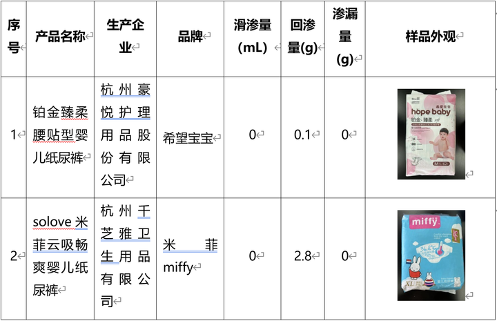 12批次杭产婴儿纸尿裤中11批次产品的滑渗量为0mL,回渗量高值仅为3.9g(标准要求为≤20g),5批次非杭产婴儿纸尿裤的滑渗量均为0mL,回渗量高值为6.4g。
