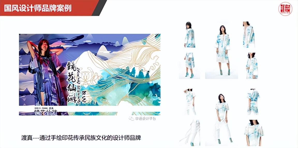 下一个品牌,渡真。这个品牌是一位有灵气的设计师做的,这位设计师持续几年都是自己在做图案设计。他的所有作品都是以系列图案呈现,比如山海经系列,镜花仙系列。上图是镜花仙系列,品牌设计师会根据中国传统文化故事做一些水彩和国画图案。